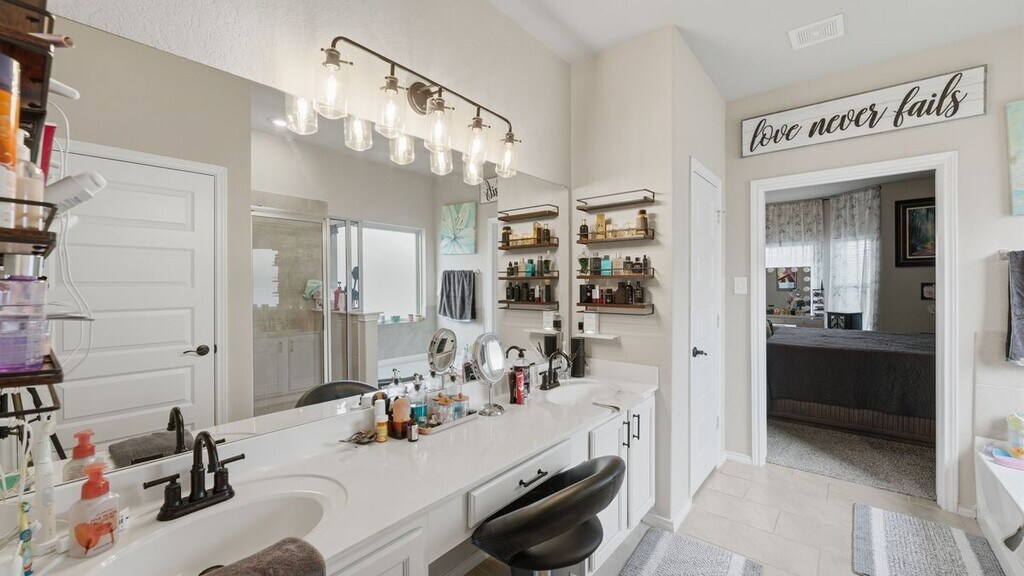 PRIME LOCATION! Welcome to your new owner-managed, Cul-de-Sac, greenbelt, home outfitted with Tesla solar panels in the Texas Research Park subdivision. This 2 story, 2767sf, 5BR with primary bedroom downstairs and an additional bedroom, guest suite and two bedroom with a loft area upstairs, 4 full bathrooms (2 up and 2 down), open floor plan, tile and carpet flooring, large kitchen with gas cooking, spacious island that seats four comfortably overlooks into the family room is ideal for a growing family. The xeriscape backyard includes a hot tub, extended epoxy coated patio with a pergola is ideal to relax behind your privacy screens. The garage is decked out with 270 degrees of above head storage racks, epoxy flooring, tankless gas water heater and a top of the line water softener available for use. The owner's suite features: bay windows, walk-in closets, dual vanity sinks with a separate shower and garden tub configuration. Easy access to I-10 and FM 1604, you will find a quick commute to schools in the B+ rating for Northside ISD, Walmart, HEB, Lackland AFB, The Rim Shopping Center and the San Antonio Riverwalk. SCHEDULE YOUR TOUR TODAY!