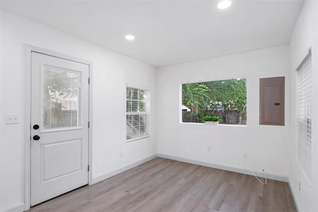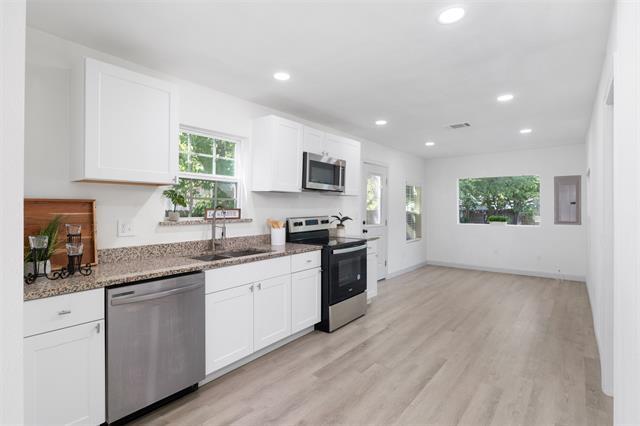 Nestled at the end of a quiet cul-de-sac in the beloved Oakhurst neighborhood, this thoughtfully updated 3-bed, 2-bath home blends timeless charm with modern comfort. Enjoy fresh paint, new blinds, and landscaping. Fully remodeled just two years ago, it features an open-concept layout with durable laminate flooring, neutral paint, and abundant natural light throughout. The kitchen offers granite countertops, updated white cabinetry, and stainless steel appliances, all installed during the renovation. Both bathrooms showcase stylish, high-end finishes, including a second bath added during the remodel. The spacious primary suite provides a peaceful retreat, while the expansive backyard is perfect for entertaining or play. Updates from 2023 include a new roof, tankless water heater, and new appliances. All just minutes from Downtown Fort Worth and the Stockyards, this move-in-ready home delivers both location and lifestyle.
