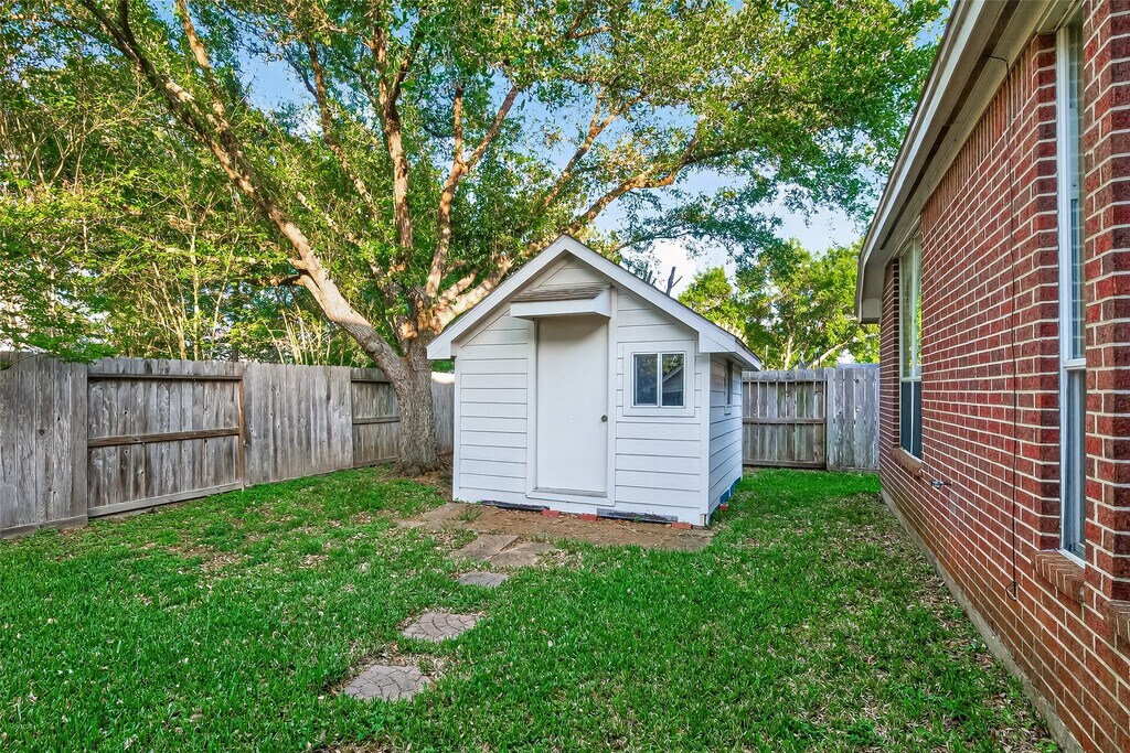 All Ambassador Management Group residents are enrolled in the Resident Benefits Package. Located in a desirable manned-gated community,this beautiful one-story 3-bedroom,2.5-bath home offers great curb appeal and a welcoming covered front porch entry. Inside,you’ll find formal living and dining areas at the front—perfect for entertaining. The spacious kitchen features a huge island,ample counter space,and opens to the family room for easy everyday living.Two secondary bedrooms share a full hallway bath,while the private primary retreat is tucked behind the family room and includes an updated bathroom with double sinks. A convenient half bath adds extra functionality for guests.Enjoy outdoor living on the covered patio with an easy-to-maintain backyard and a storage shed for added space. Fantastic location with quick access to Grand Parkway (99) and I-10,plus shopping and dining nearby. This one won’t last—schedule your showing today! MLS# 91114771