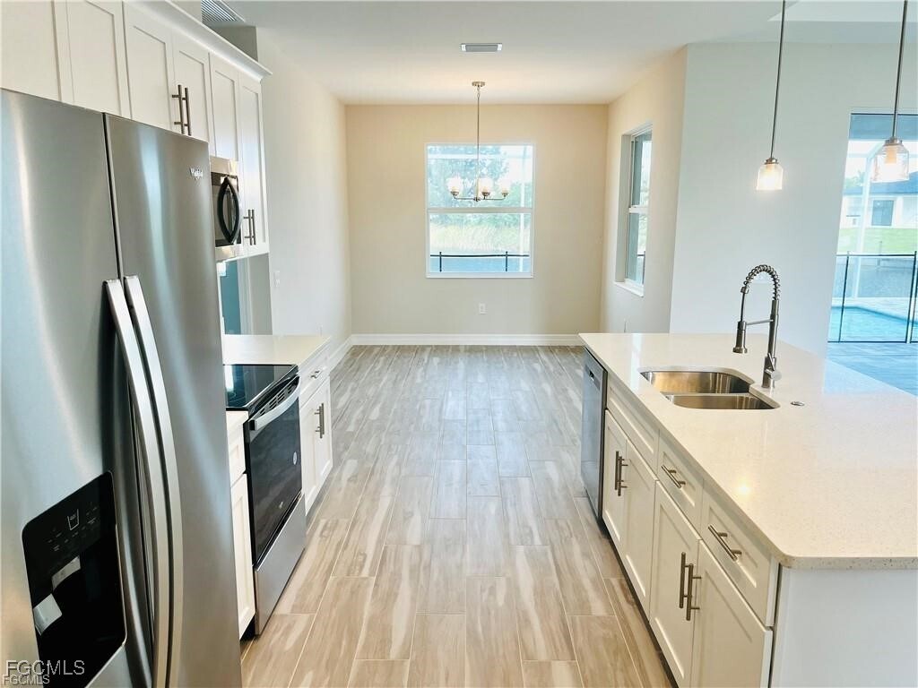 This beautifully designed and newly built 3-bedroom,2-bathroom home offers modern living and serene Water views. With 10-foot ceilings throughout,the open and airy atmosphere sets a welcoming tone from the moment you step inside. The heart of the home is the inviting living area,featuring elegant plank flooring that extends throughout the home. Natural light floods the room,accentuating the high ceilings and creating a warm and welcoming environment. The living area seamlessly flows into the kitchen,where you’ll find exquisite hardwood cabinets with soft-close drawers,gleaming quartz countertops,and top-of-the-line appliances. The large master bedroom is a true retreat,offering ample space and a spa-like en-suite bathroom. Indulge in the luxurious carwash shower and plenty of closet space. Step outside to your private back lanai and discover a slice of paradise. Enjoy stunning sunsets every day and breathtaking views over the water. The highlight of the outdoor space is the impressive 14x28 pool,perfect for cooling off or entertaining guests while soaking in the serene surroundings. This home offers the perfect blend of comfort and elegance,with every detail meticulously designed to enhance your lifestyle. From the high ceilings and finishes to the tranquil canal views and stunning sunsets,this property is a true sanctuary. Don't miss your chance to experience the ultimate in Florida living!