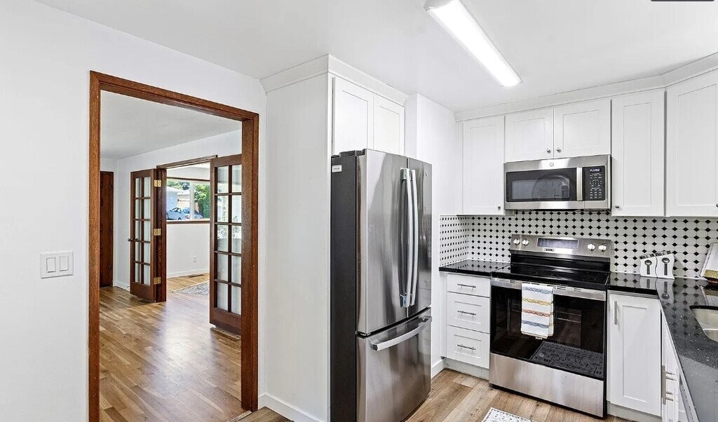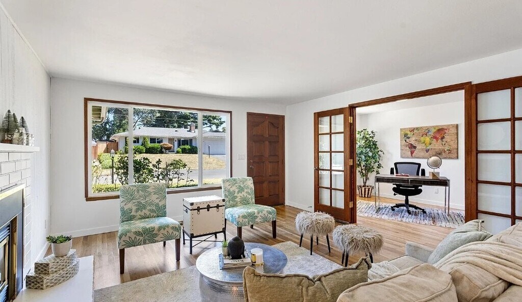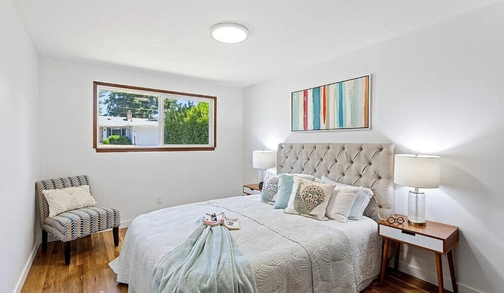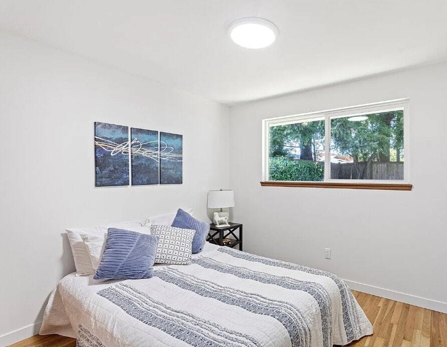 Located in the desirable Microsoft neighborhood near top schools and daily conveniences, this upgraded and renovated rambler offers easy, single-level living with 3 bedrooms, a den, new windows throughout and and no stairs. Enjoy a bright living room with fireplace, refinished white oak hardwoods, updated kitchen with new appliances, remodeled baths, and LVP flooring in the kitchen and one room. The oversized primary suite with bath can also serve as a family room. Features include a new furnace, fresh paint throughout, nest thermostat, and a spacious 2-car garage with storage/shop space that has 240v outlet. Step outside to a fully fenced, level yard with covered patio, mature trees, and shed.