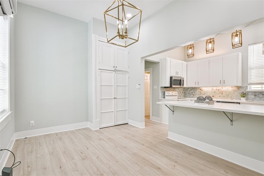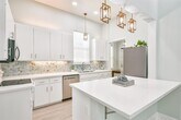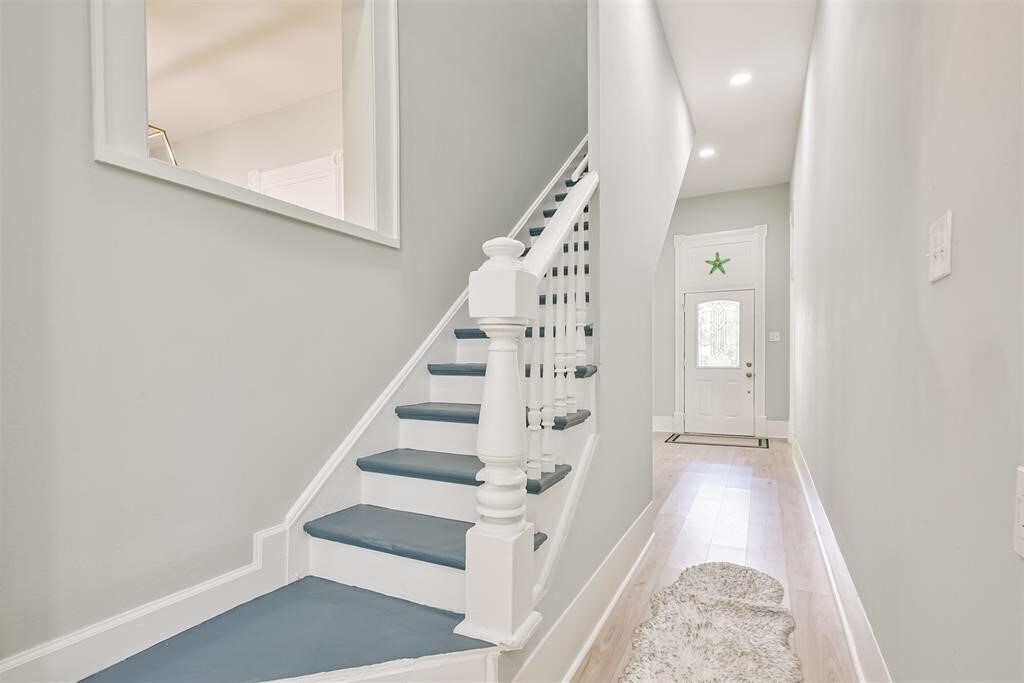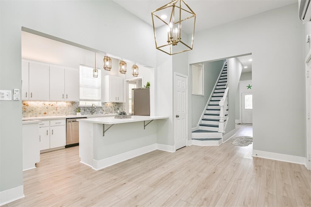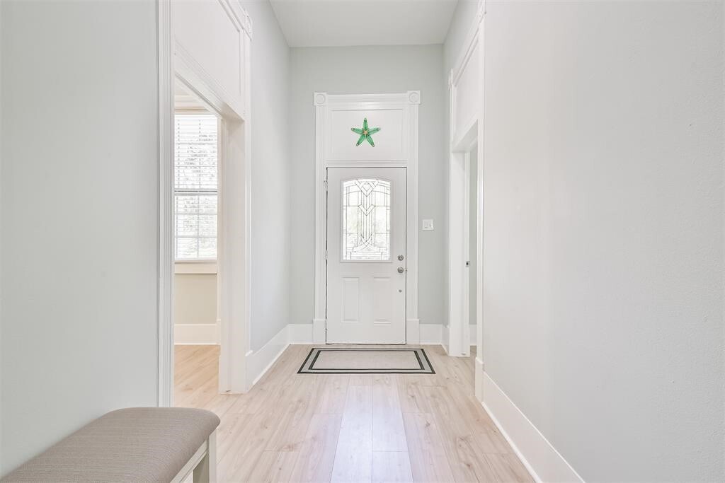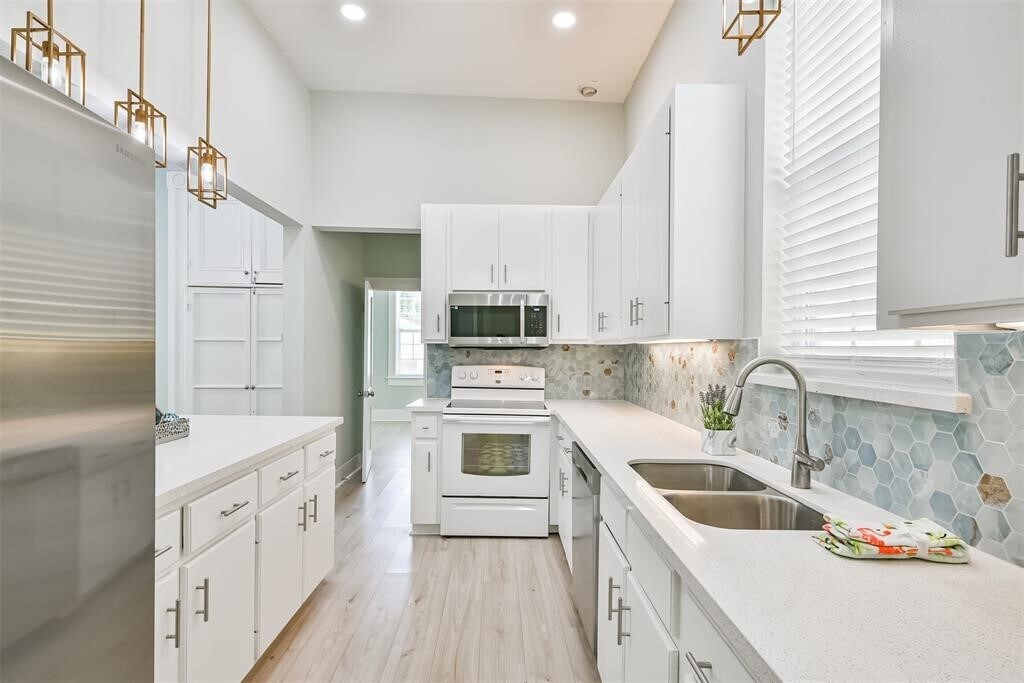 Steps from the beach,short bike ride to the Strand,blocks from Seawall restaurants and Pleasure Pier! This bright and airy coastal cottage is located on prestigious Avenue O. A welcoming home with high ceilings,bleached,waterproof,plank flooring,new paint throughout,formal dining room and large combination kitchen and breakfast room. Kitchen includes island,new stainless steel appliances,Quartz countertops,modern tile backsplash and plenty of pantry and storage space. Spacious front bedroom with en suite bathroom,featuring walk in shower,plus outside access to side porch. A bedroom/dedicated work space and bathroom is also located on the first floor. Upstairs is perfect for large and/or extended families with two large bedrooms,perfect for kids,guests or a home entertainment area. Backyard is tastefully landscaped with low maintenance xeriscaping. Home is kept very cool with efficient split systems. Also includes a 2 car garage,which is a luxury on the Island! MLS# 36929701
