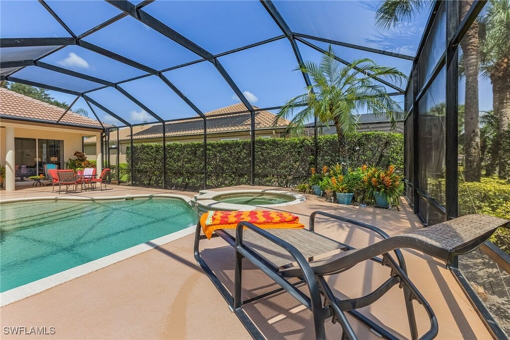 Beautiful home located in the Cypress Cove neighborhood of the Club at Grandezza!This fantastic home offers 3 bedrooms,3 bathrooms,separate living room,great room and spacious eat-in kitchen with center island,pantry and counter stools. Primary bedroom has dual sinks,soaking tub and large walk-in shower. Guest bath has shower tub combo and the 3rd bathroom with walk-in shower leads directly out to the lanai. The fantastic lanai is wonderful for entertaining or relaxing as it boasts roomy areas for outdoor dining while overlooking the view of lake and landscaped area. The heated pool with quieting waterfall and spa add to the ambiance of this serene and charming home. Everything you need to live the resort-style life is here in this immaculate and well-maintained gem located in a prime location in Estero.The Club at Grandezza offers 3 restaurants,large community pool and spa,fitness center,pro shop,bocce and basketball courts,tennis and many social and exercise programs to benefit all residents. Minutes from shopping,dining and the airport. This home is a rare find and a must-see!