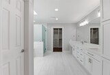 Welcome to this upgraded single-story home featuring 3 spacious bedrooms and 2.5 bathrooms,designed for comfortable,modern living. Natural light pours in through double-pane windows,creating a bright and inviting atmosphere throughout. The living area offers recessed lighting and a mounted TV for a clean,contemporary feel. The home features no carpet,ceiling fans in every room,and updated lighting for a low-maintenance finish. The kitchen showcases white cabinetry,stainless steel appliances,a farmhouse sink,and a layout overlooking the backyard. The expanded primary suite includes a large walk-in closet with built-ins and an en-suite bath with double vanities,a stand-up shower,soaking tub,and ample storage. A secondary bathroom was remodeled in 2020 with a quartz vanity. Additional highlights include: • 1-car garage • Spacious,open layout • Modern finishes throughout • Bright,airy atmosphere Move-in ready and thoughtfully updated—all on one level. MLS# 88000385