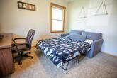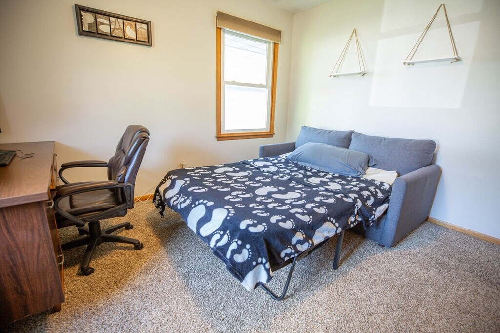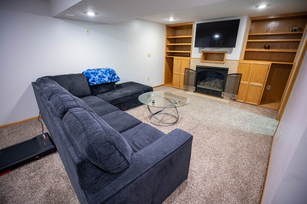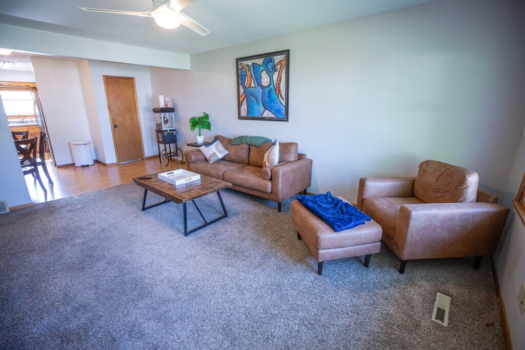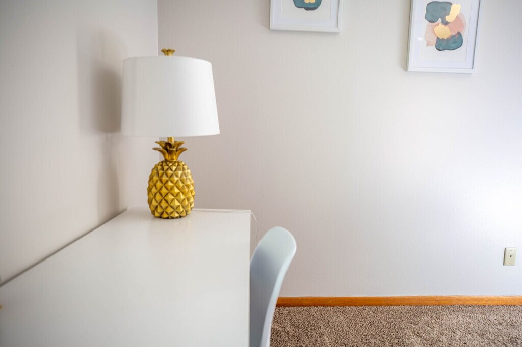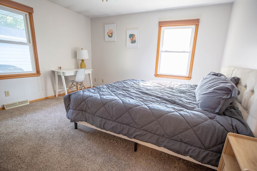 Work hard and relax harder in this stylish 3-bedroom, 2.5-bathroom Ankeny home, located just 5 minutes from Prairie Trail, 15 minutes from downtown Des Moines, and 25 minutes from Iowa State University. With bright rooms, fresh décor, and cozy lounges, this family-friendly apartment is perfect for vacations. Feel at home with king and queen suites, an office with gig Ethernet, a printer, a monitor, and a pull-out sofa. Enjoy entertainment with 75? and 43? Smart TVs and a popcorn cart. The apartment also features a treadmill, a gas-fireplace lounge, and a fully stocked kitchen with a smart-lock entry. The apartment offers a king suite on the main level with a king-size bed, hotel-quality linens, an en-suite half bath, a walk-in closet, and a dresser. The queen suite in the basement includes a queen-size bed with premium linens, a private full bath with a tub and shower, and ample closet space. The third bedroom doubles as an office with a desk, ergonomic chair, 19? monitor, printer, and a full-size pull-out sofa. The living room on the main level features a 75? 4K smart TV, a vintage popcorn cart, plush seating, and oversized windows with blackout shades. The basement lounge includes a 43? smart TV, a cozy gas fireplace, a treadmill, and sectional seating. The kitchen is equipped with stainless appliances, quality cookware, and a five-seat dining nook. Free street parking is available for guests. For additional convenience, inquire about early check-in and extra cleaning services. Explore the vibrant neighborhood with nearby attractions such as Firetrucker Brewery for craft beer and live music, Jethro’s BBQ for famous Iowa BBQ, and Main Street Café for homestyle breakfast and coffee. Enjoy local favorites like TrailSide Tap for pizza and brews and District 36 Wine Bar and Grill for upscale dining and cocktails. Visit Iowa State University, Prairie Trail District, High Trestle Trail Bridge, Saylorville Lake, Big Creek State Park, and downtown Des Moines for a variety of activities and entertainment. The apartment features two interior staircases connecting the main level and basement lounge, so please watch your step if mobility is limited. The treadmill has a maximum user weight of 300 lb and should be used at your own risk. A smart-lock camera monitors only the exterior entry for security, with no other cameras on site. Pets, smoking, and parties are not allowed, and quiet hours are from 10 pm to 7 am to maintain neighborhood peace. Driveway snow removal is provided in winter, but street parking may follow city plow rules after heavy storms. Includes a desk, ergonomic chair, 19? monitor, printer, and gig-speed internet with an Ethernet port for maximum speed. A laptop computer is not included. [SI]