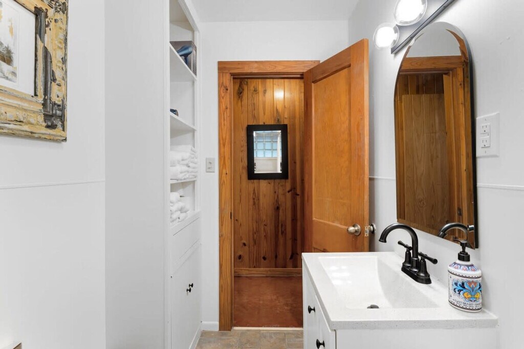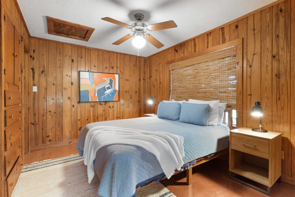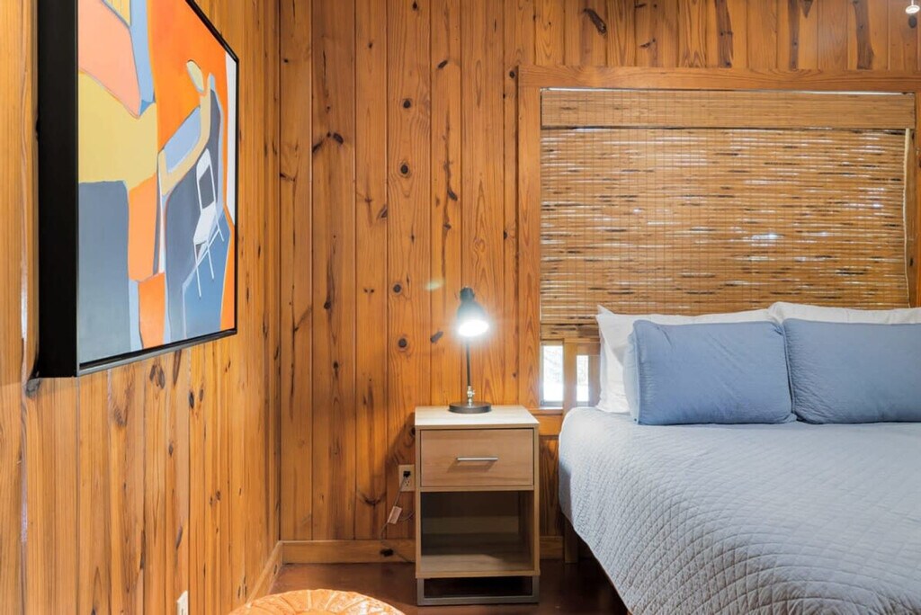 Unwind in the heart of Texas Hill Country, surrounded by deer and waterlilies. This tranquil retreat, nestled in nature’s embrace, features 2 cozy bedrooms and 1 full bathroom—perfect for up to 4 guests. With enchanting Creekside views, this getaway promises an unforgettable escape for nature lovers and relaxation seekers alike. Settle into this cozy 2-bedroom unit, perched right above Cypress Creek. Each bedroom is equipped with a queen-size bed and built-in dressers for plenty of storage. The modern bathroom features a clean design along with essential amenities. This is the perfect Wimberley location! Less than 10 minutes from H-E-B Grocery, Wimberley town square with many cute shops and restaurants, recreational tennis courts, Quicksand Golf Course, Cypress Falls, Jacobs Well, and Blue Hole Regional Park. To ensure a smooth check-in experience, you'll be asked to review and sign the house rules and terms and conditions via the Guest App Link sent in your reservation confirmation. Make sure to complete this step at least 24 hours before your arrival to receive your arrival instructions. Pets, smoking, fireworks, and parties or events are not allowed. Quiet hours are from 10 PM to 7 AM. The primary guest must be at least 21 years old and present for the entire reservation. There is a small fire pit in the backyard; guests are asked to bring their own supplies, extinguish any flames or coals after each use, and adhere to any county burn ban in effect. If any furniture is moved, please place it back in the original space where it was found. In the event that you need to use the hard key, please place it back in the lockbox before departing. Failure to return any keys used to the lockbox will result in a $50 replacement fee per key. This is a dark sky community, so please be sure to shut off any lights when they are not in use. The cowboy pool is unit 1's to utilize and is included in their rate. Please do not utilize the cowboy pool. Please do not set the home's thermostat above 76 (heating) or below 68 (cooling). To avoid overloading the system, adjust the thermostat by no more than 2 degrees per hour and keep the doors and windows closed as much as possible. This is a rural property out in the Texas Hill Country, where it's common to encounter wildlife such as birds, reptiles, deer, and other local fauna. Rural areas like this may have limited or different services compared to urban settings, including cell phone and delivery services. Texas is known for its bug inhabitants. Proactive measures are taken to manage this, and it shouldn't pose a problem during your stay. To help keep them outside, please keep all windows and doors closed. Feel free to use the bug spray underneath the sink. [SI]