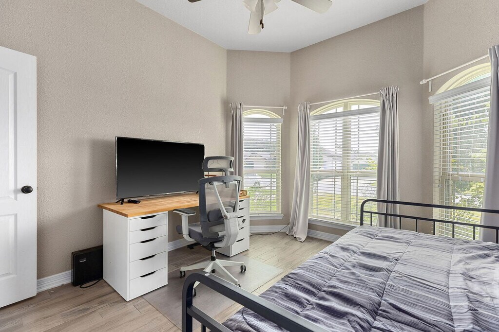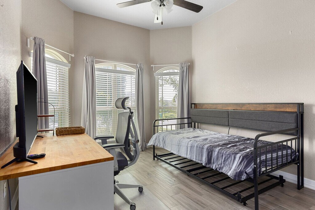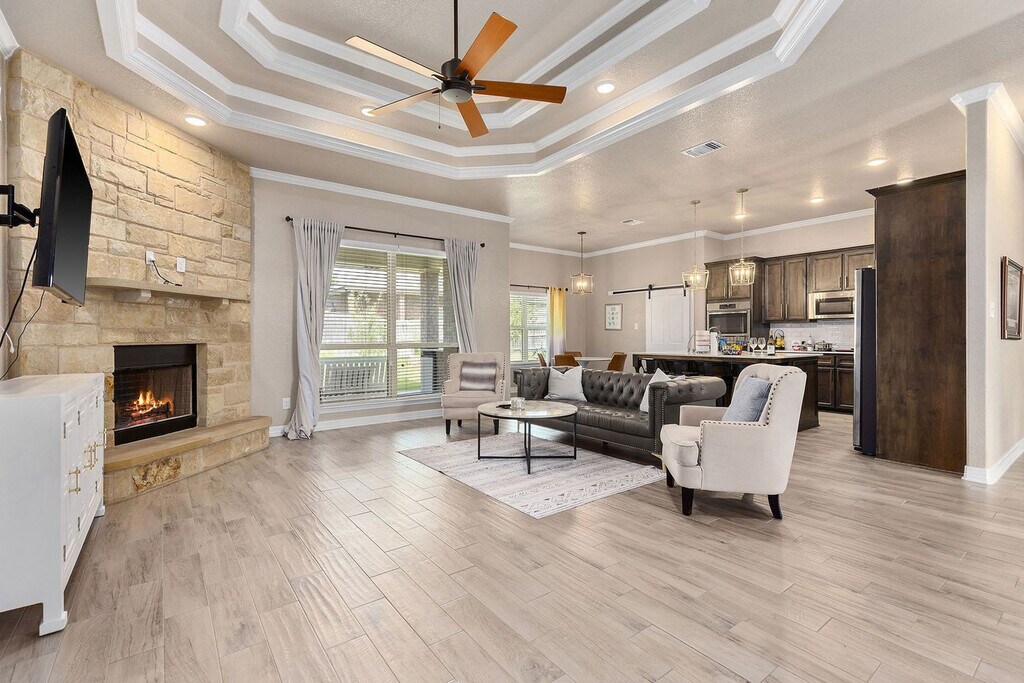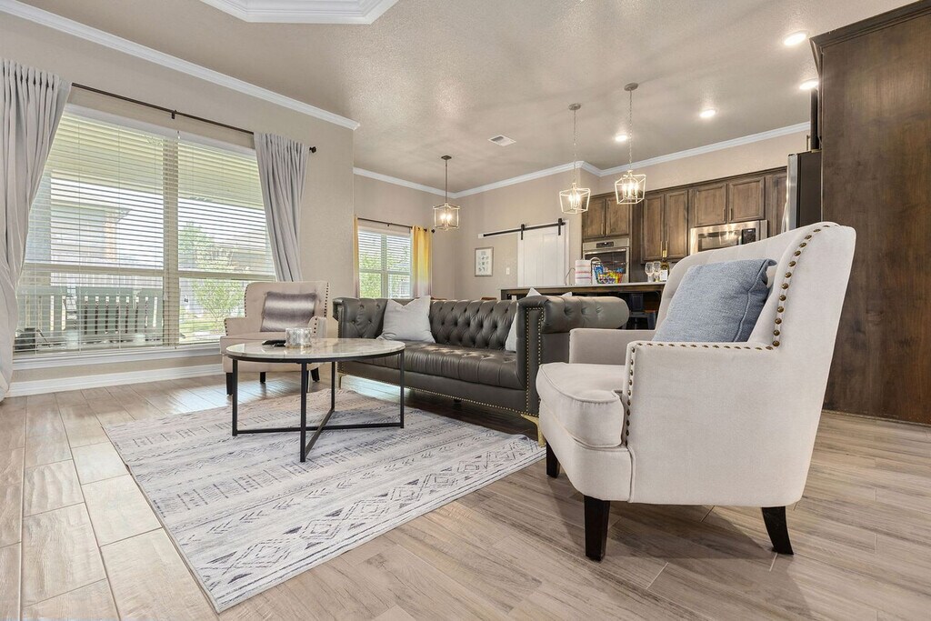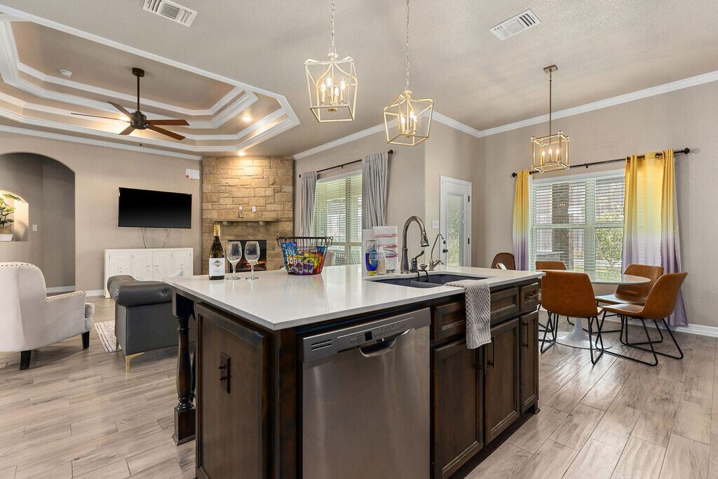 Welcome to this luxury home in Harker Heights! Feel at home in this spacious property, conveniently located next to Harker Heights High School, 5 minutes from Stillhouse Lake, and 15 minutes from the main gate of Fort Hood. This home features modern appliances, high-end finishes, and 4k HD Roku TVs in every room. The fully equipped kitchen includes a microwave, oven, stove, refrigerator/freezer, dishwasher, coffee maker with coffee essentials, toaster, sink, trays, glasses, silverware, pots and pans, and cooking oil. There is seating for 5 at the dining table and 4 at the breakfast bar. A washer and dryer, iron, and ironing board are available for your convenience. The living room offers comfortable sofas, a 65" 4k Smart TV, a coffee table, reading lamps, and shelf space. EV charging is available with a 220V outlet (bring your own power adapter). Pet stays are welcome with a fee of $25 per pet per night for stays of 1-5 nights, $150 per pet for stays of 6-14 nights, and $10 per pet per night for stays of 15+ nights. Early check-in and late check-out are available for a fee, subject to availability: Early arrival after 2 PM CST for $40, super early arrival after 12:30 PM CST for $55, and red-eye arrival any time after 9 AM CST for $100. Late check-out until 12 PM CST for $40, super late check-out until 1:30 PM CST for $55, and mega late check-out any time until 5 PM CST for $100. Situated in a quiet neighborhood, this home is close to shopping, has easy access to I-14, and is minutes from Stillhouse Lake. It's also conveniently located 4.2 miles from AdventHealth Central Texas, 2.8 miles from Seton Medical Center Harker Heights, 6.5 miles from the University of Central Texas, 3.4 miles from I-14, 1.9 miles from the new Walmart Supercenter, and 10 miles from Killeen-Fort Hood Regional Airport. Quiet hours are between 10 PM and 7 AM. Exterior-only security cameras are present on the garage and front door. Unauthorized visitors are not permitted. [SI]