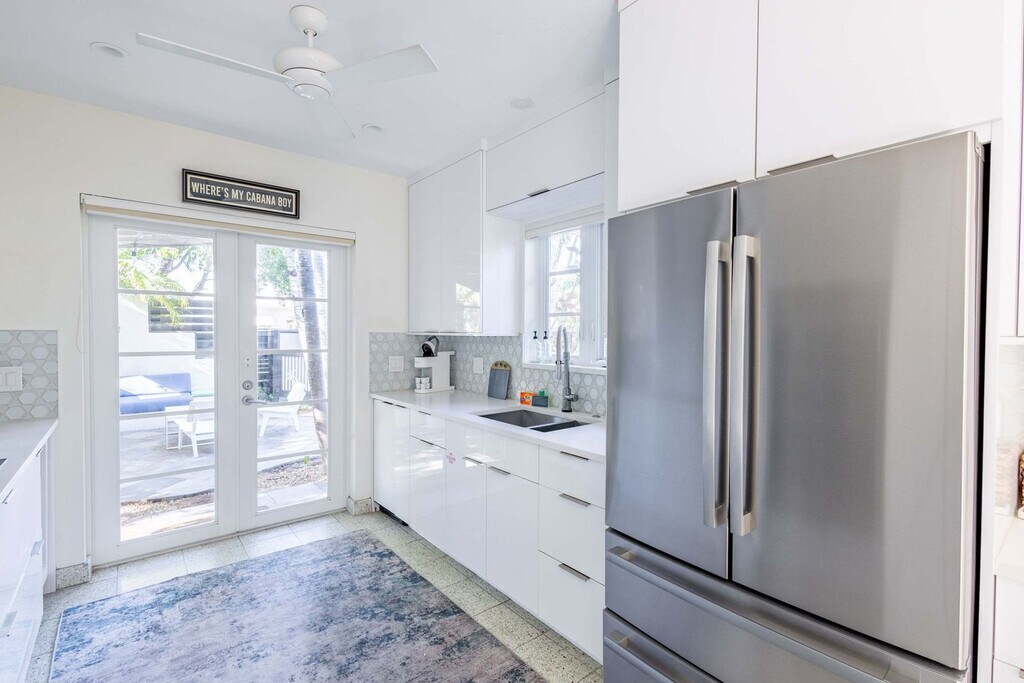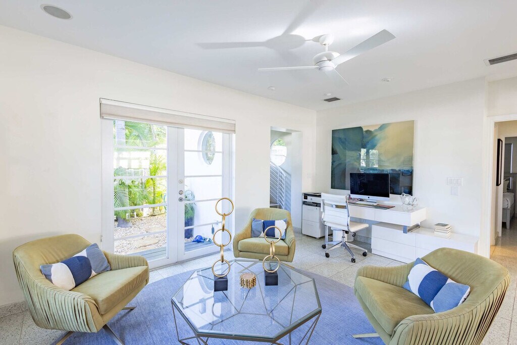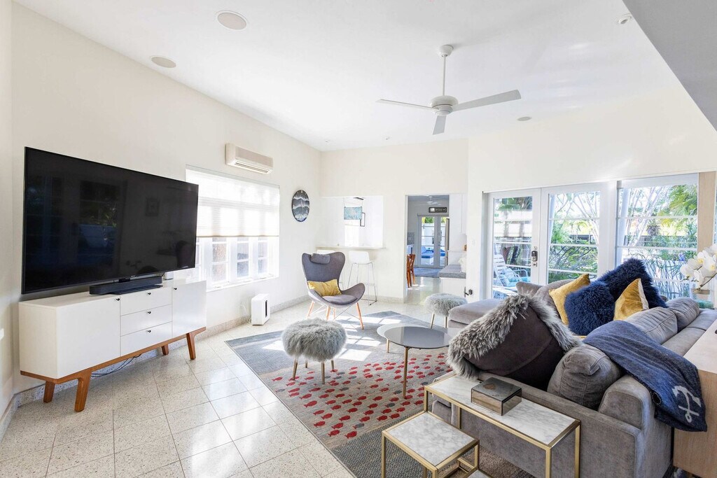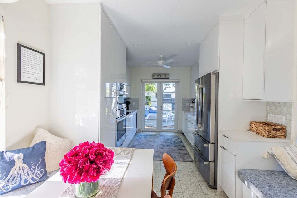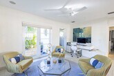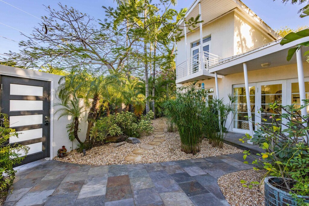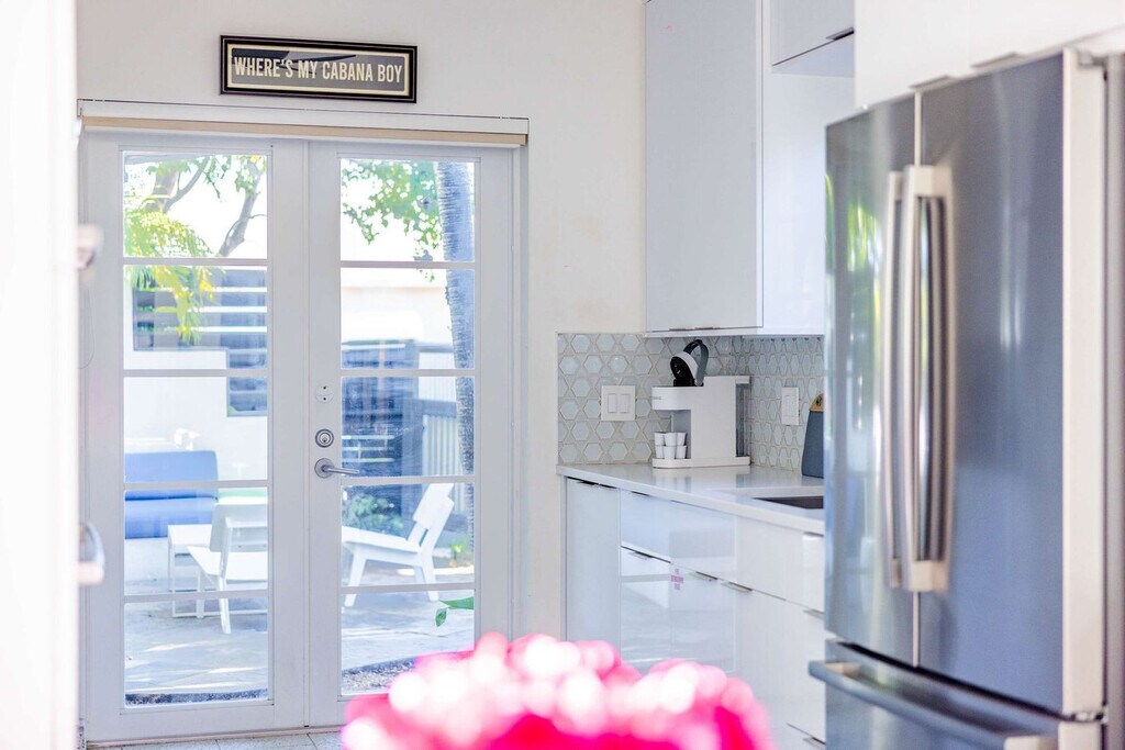 Welcome to Hidden Oasis, a luxurious three-bedroom, two-bathroom home nestled in the heart of Midtown, Key West. This stunning property offers contemporary luxury with an open floor plan, situated on a private fenced-in yard on a corner lot with lush tropical landscaping. Feel at home as you step through French doors to the backyard, featuring a private heated pool, lounge seating, a TV, a grill, and a soothing waterfall feature, making it the perfect retreat. Located just half a mile from Smathers Beach and a quick ten-minute drive to Duval Street and downtown, this home provides the ideal blend of relaxation and convenience. Adorned with contemporary flair and modern finishes, this home comfortably sleeps up to six guests. The first-floor bedroom features a king-size bed, floor-to-ceiling mirrors, a smart TV, patio doors, a ceiling fan, and easy access to the downstairs full bathroom. The master bedroom, accessible via a spiral staircase, boasts a king-size bed, a corner make-up vanity, a private balcony, a platform bed with storage, a smart TV, and vaulted ceilings. The luxurious master bathroom includes dual glass bowl sinks and a walk-in shower. The third bedroom, adjacent to the living area, is designed with two built-in daybeds offering flexibility. The newly remodeled kitchen features custom-built cabinets, stainless steel appliances, a double-door fridge, and an adjacent dining area with built-in bench seating and a breakfast bar. Parking for up to four vehicles is included with your stay, located around the perimeter of the property. For additional vehicles, recommendations for parking can be provided upon request. Pets are welcome with a few requirements: they must weigh less than 40lbs, there is a $15 per night fee per pet, and a maximum of two pets is allowed. Mid-stay cleans are available upon request, and a private washer and dryer are provided with starter detergent and dryer sheets. Situated on a quiet residential street in the relaxing area of Key West known as 'Mid-Town,' this home is just a few blocks from popular Higgs Beach, Salute Beach Bar, and volleyball and pickleball courts. A short five-minute drive or ten-minute bike ride will take you to Duval Street and Key West's local attractions, including nightlife, historic sites, restaurants, and shopping. The central location makes it easy to explore Key West by bicycle, pedi-cab, moke, scooter, golf cart, Uber, taxi, or on foot, with many attractions within walking distance. This property has a 28-night minimum stay requirement. Damages to the property or additional cleaning due to excessive mess are subject to charges. The third bedroom is a small den, and pets are welcome with specific requirements and fees. This home is perfect for working from home, featuring a spacious desk, a printer, and ample storage, ensuring a comfortable and efficient workspace. A laptop computer is not included.