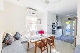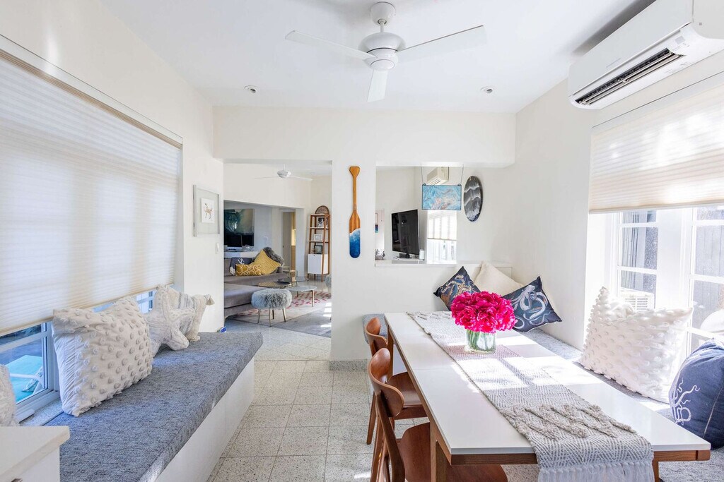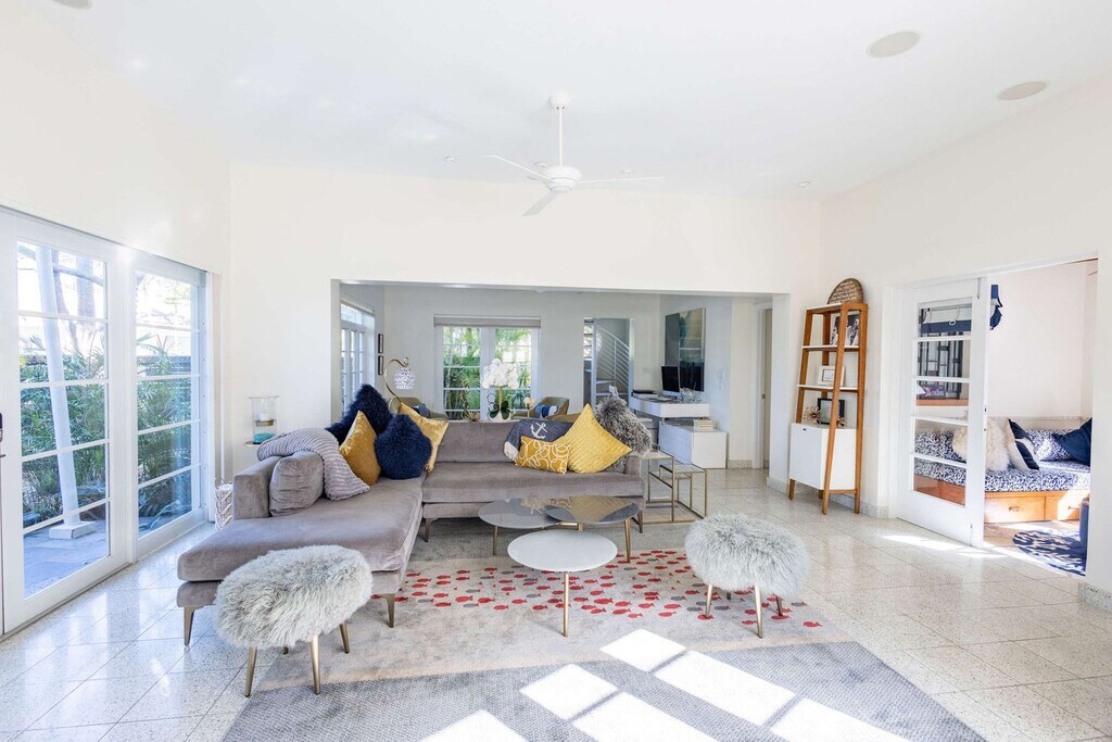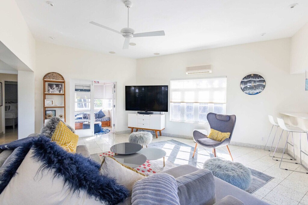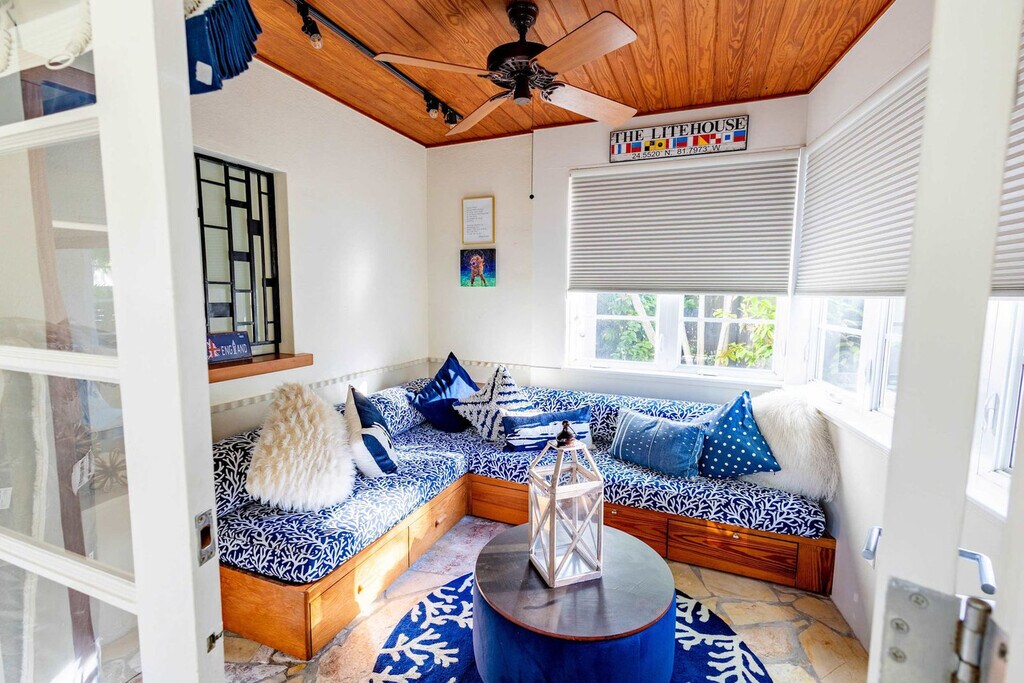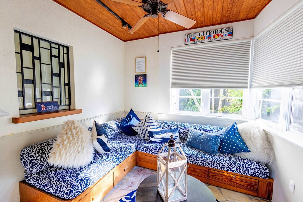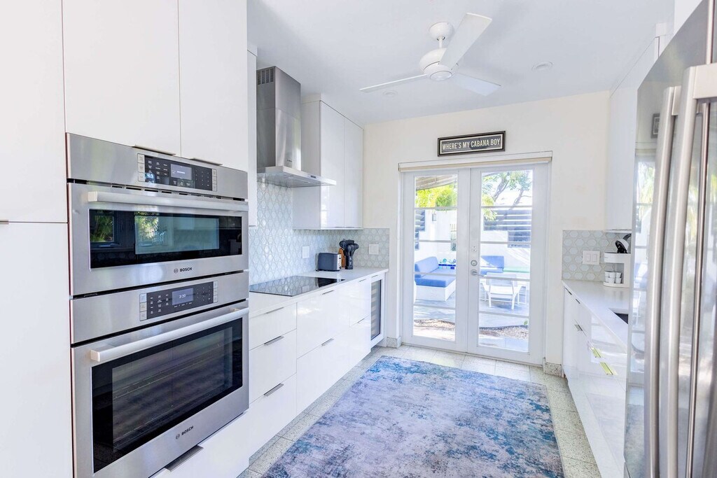 Welcome to Hidden Oasis, a luxurious three-bedroom, two-bathroom home nestled in the heart of Midtown, Key West. This stunning property offers contemporary luxury with an open floor plan, situated on a private fenced-in yard on a corner lot with lush tropical landscaping. Feel at home as you step through French doors to the backyard, featuring a private heated pool, lounge seating, a TV, a grill, and a soothing waterfall feature, making it the perfect retreat. Located just half a mile from Smathers Beach and a quick ten-minute drive to Duval Street and downtown, this home provides the ideal blend of relaxation and convenience. Adorned with contemporary flair and modern finishes, this home comfortably sleeps up to six guests. The first-floor bedroom features a king-size bed, floor-to-ceiling mirrors, a smart TV, patio doors, a ceiling fan, and easy access to the downstairs full bathroom. The master bedroom, accessible via a spiral staircase, boasts a king-size bed, a corner make-up vanity, a private balcony, a platform bed with storage, a smart TV, and vaulted ceilings. The luxurious master bathroom includes dual glass bowl sinks and a walk-in shower. The third bedroom, adjacent to the living area, is designed with two built-in daybeds offering flexibility. The newly remodeled kitchen features custom-built cabinets, stainless steel appliances, a double-door fridge, and an adjacent dining area with built-in bench seating and a breakfast bar. Parking for up to four vehicles is included with your stay, located around the perimeter of the property. For additional vehicles, recommendations for parking can be provided upon request. Pets are welcome with a few requirements: they must weigh less than 40lbs, there is a $15 per night fee per pet, and a maximum of two pets is allowed. Mid-stay cleans are available upon request, and a private washer and dryer are provided with starter detergent and dryer sheets. Situated on a quiet residential street in the relaxing area of Key West known as 'Mid-Town,' this home is just a few blocks from popular Higgs Beach, Salute Beach Bar, and volleyball and pickleball courts. A short five-minute drive or ten-minute bike ride will take you to Duval Street and Key West's local attractions, including nightlife, historic sites, restaurants, and shopping. The central location makes it easy to explore Key West by bicycle, pedi-cab, moke, scooter, golf cart, Uber, taxi, or on foot, with many attractions within walking distance. This property has a 28-night minimum stay requirement. Damages to the property or additional cleaning due to excessive mess are subject to charges. The third bedroom is a small den, and pets are welcome with specific requirements and fees. This home is perfect for working from home, featuring a spacious desk, a printer, and ample storage, ensuring a comfortable and efficient workspace. A laptop computer is not included.