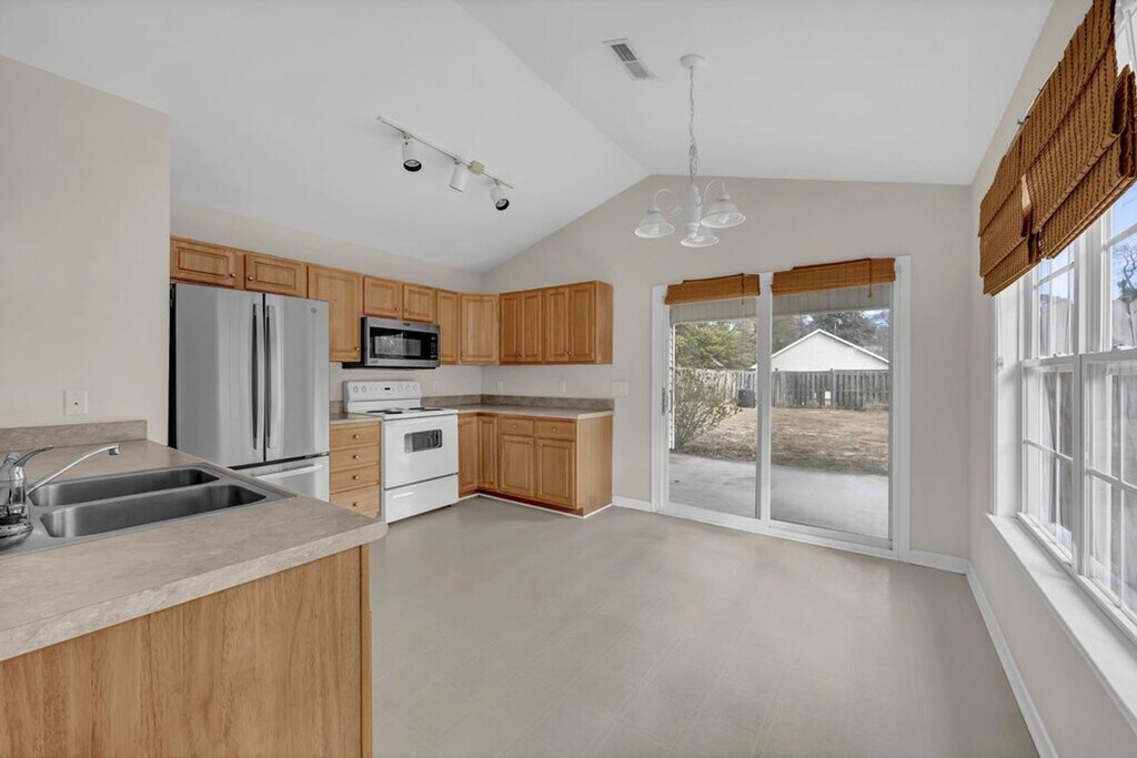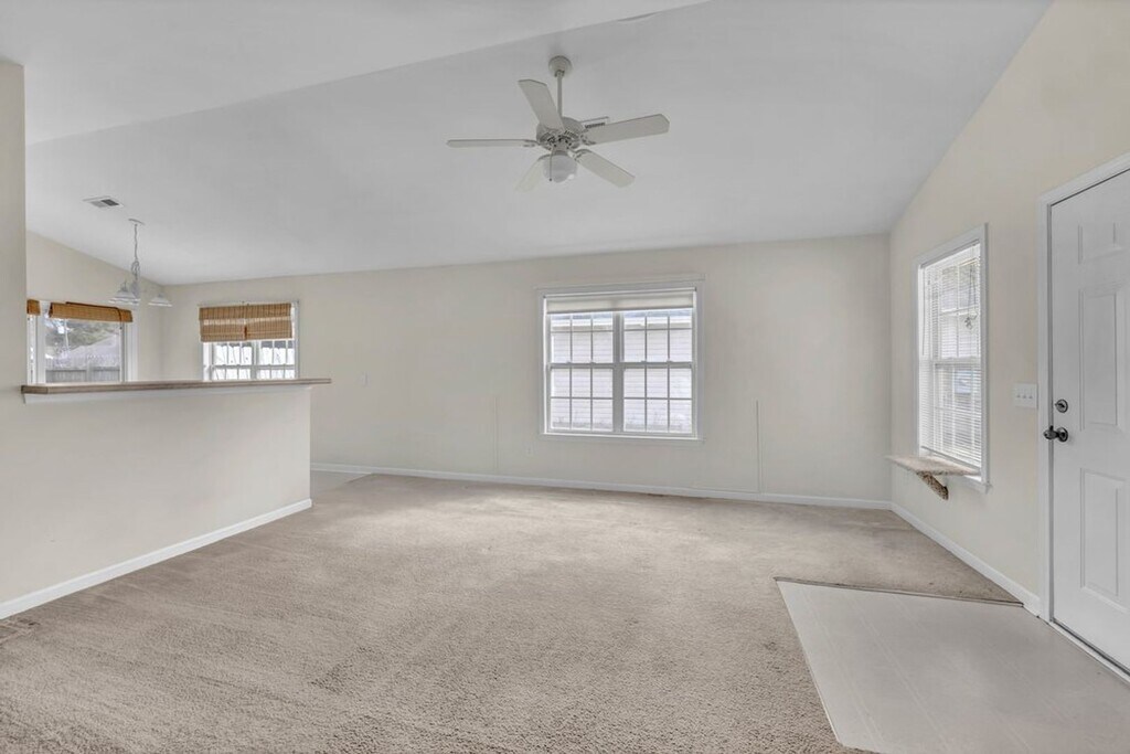 **Landscaping and exterior repairs are scheduled on the owner's behalf.** This classic home offers a spacious open floor plan perfect for both everyday living and entertaining. The vaulted ceiling in the great room creates an airy, light-filled space that feels even larger and more inviting. The seamless flow between the living, dining, and kitchen areas makes gathering with family and friends easy and comfortable. All three bedrooms feature generously sized walk-in closets, providing ample storage and organization. The home includes two full bathrooms, offering both convenience and functionality for residents and guests alike. Step outside to enjoy the covered back porch; an ideal space for morning coffee, relaxing evenings, or weekend grilling. The two-car garage provides secure parking and additional storage space. Located just minutes from historic downtown Wilmington and beautiful Greenfield Lake, you'll enjoy quick access to shopping, dining, parks, walking trails, and local entertainment while still having the comfort of a quiet residential setting. This home combines charm, functionality, and a prime location — making it an excellent rental opportunity.