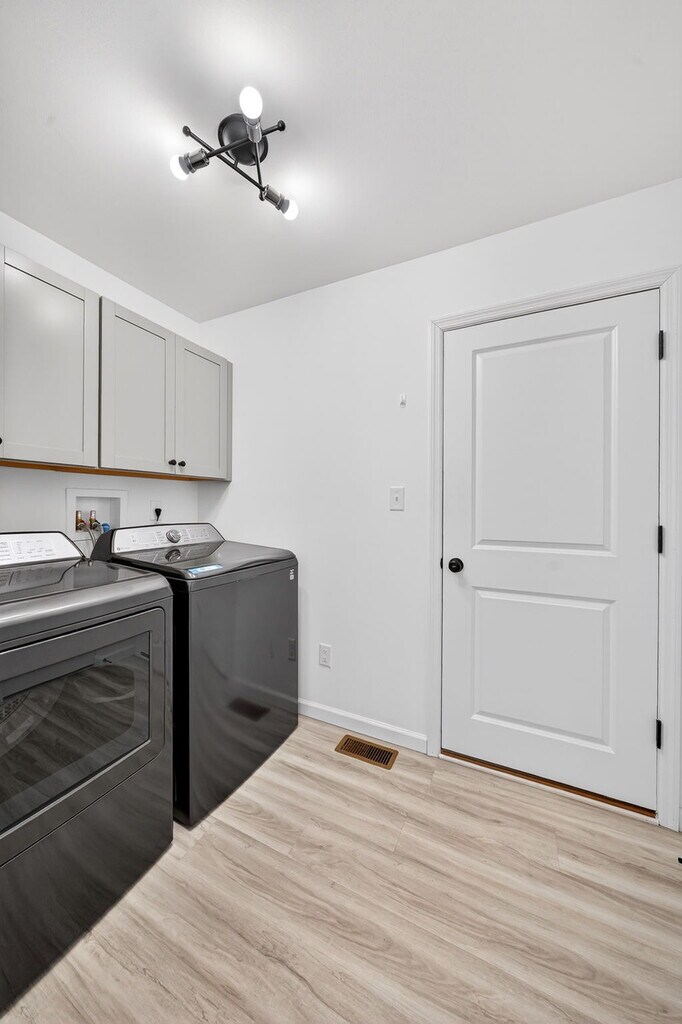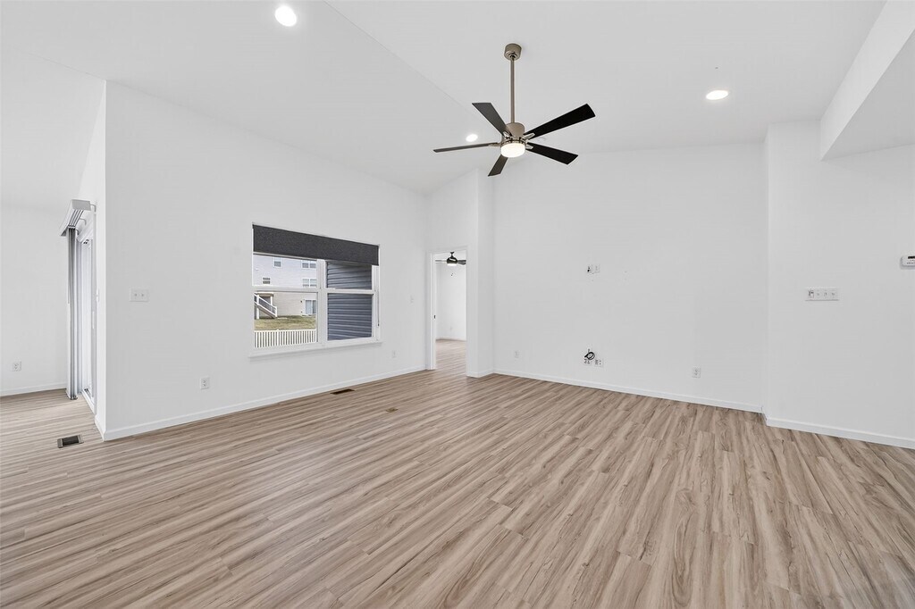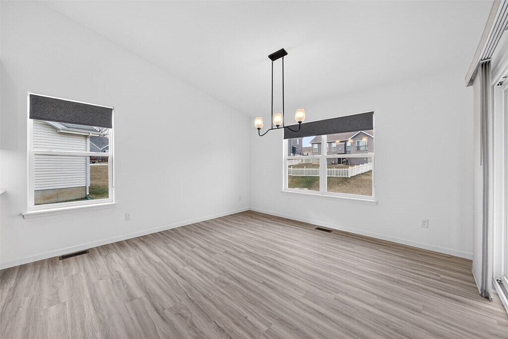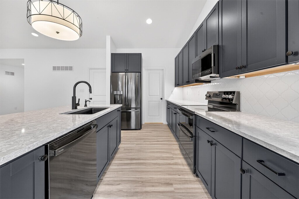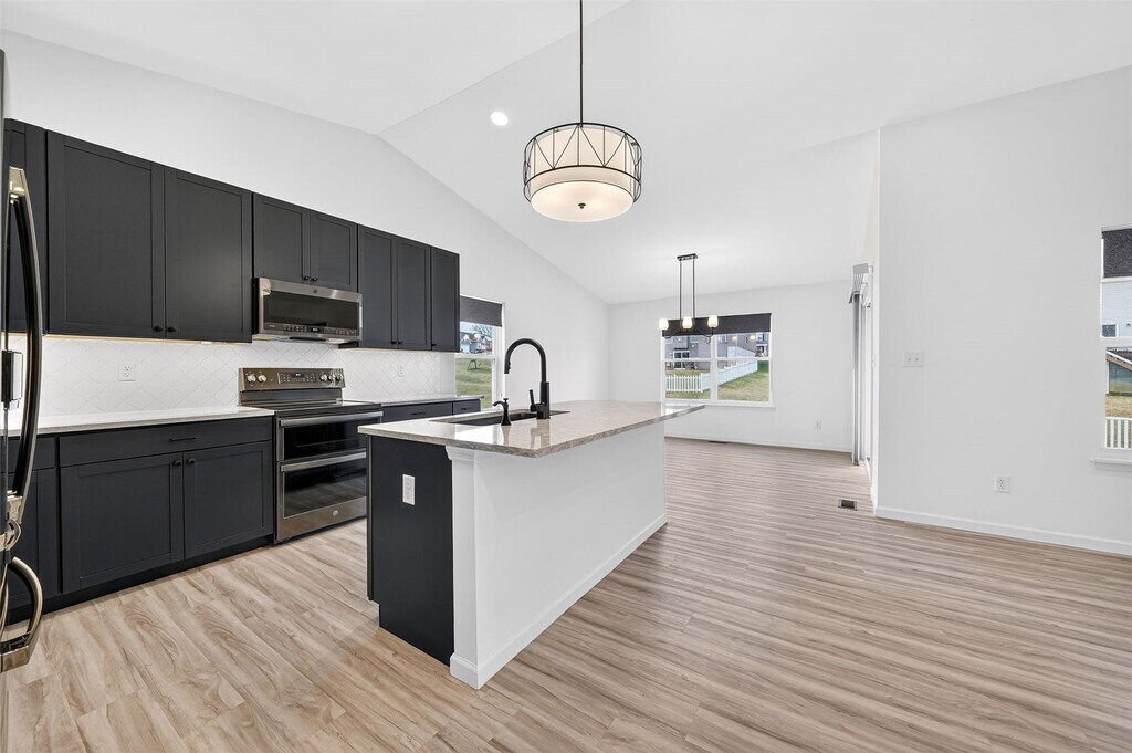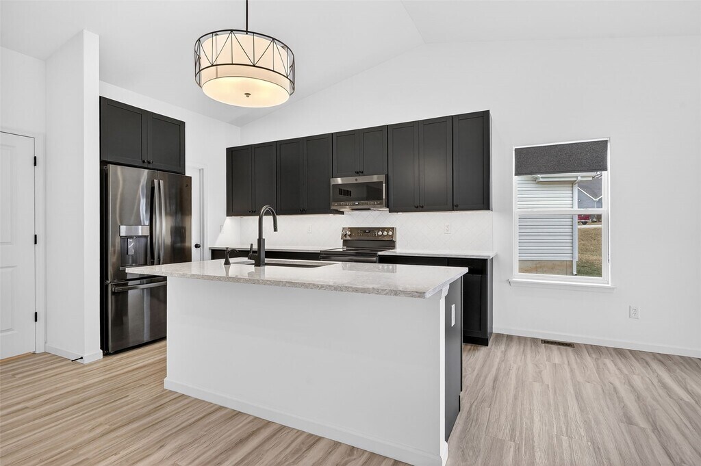Built in 2021, this thoughtfully upgraded 3-bedroom, 2-bath home offers modern design, functional space, and over 1,500 sq. ft. to enjoy in your new home. Step inside to open living with vaulted ceilings and an effortless flow designed for everyday comfort. Luxury vinyl plank flooring runs throughout the main living areas and the primary suite, delivering durability and a clean, cohesive look, while carpeted secondary bedrooms add comfort and practical use. The kitchen stands out with custom blue cabinetry, under-cabinet lighting, and a large quartz center island that anchors the space beautifully. A walk-in pantry, electric appliances, and upgraded finishes create a kitchen that balances style with function — ideal for both daily living and entertaining. The primary suite features two closets, including a walk-in, and a well-appointed ensuite bath with a standing shower and dual-vanity sinks. A full, expansive basement provides exceptional potential for storage and play. Step outside to a covered patio overlooking a large backyard, offering space to relax and gather with friends. Additional features include a whole home water softener system, spacious 2 car garage and upgraded refrigerator and washer and dryer already in place for use. No smoking, pet welcome for additional monthly fee and non-refundable pet deposit. Minimum credit score of 650 and looking for a minimum 24 month lease. Apply through $60 non-refundable payment is made through website when applying. Everyone 18+ must fill out application.
