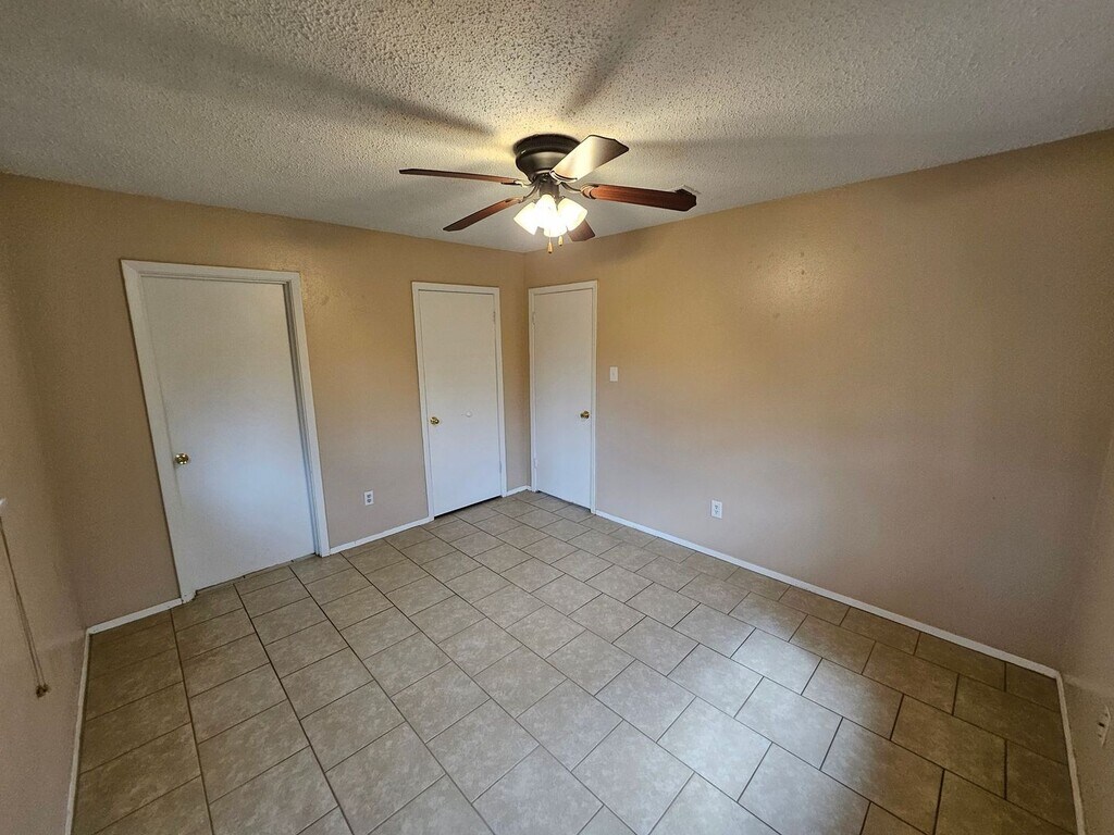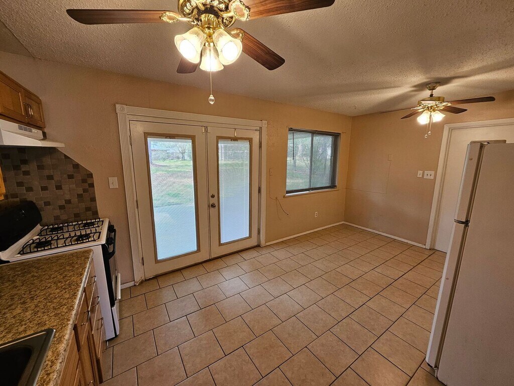 Step into this welcoming 3-bedroom, 1.5-bath brick home in New Llano with a covered front porch invites you inside, while the large covered back patio offers a great space for outdoor relaxation. The home features a one-car carport with additional driveway parking and a spacious, fenced-in backyard—perfect for pets. Inside, tiled flooring runs throughout, making cleaning easy and keeping the home cool in the summer. The large kitchen includes an eat-in area, a stove/oven, a refrigerator, a pantry, and French doors leading to the backyard. Just off the kitchen, an oversized utility room provides washer and dryer hookups. The living room is bright and inviting with a picture window for natural light and a ceiling fan for comfort. Each bedroom offers ample space, ceiling fans, and closets. The primary bathroom features a tub/shower combo, dual vanity, two mirrors, and extra cabinet storage. A half bath, attached to the primary bedroom, includes a vanity sink with storage and a toilet. This home is move-in ready and offers a great balance of function and charm.