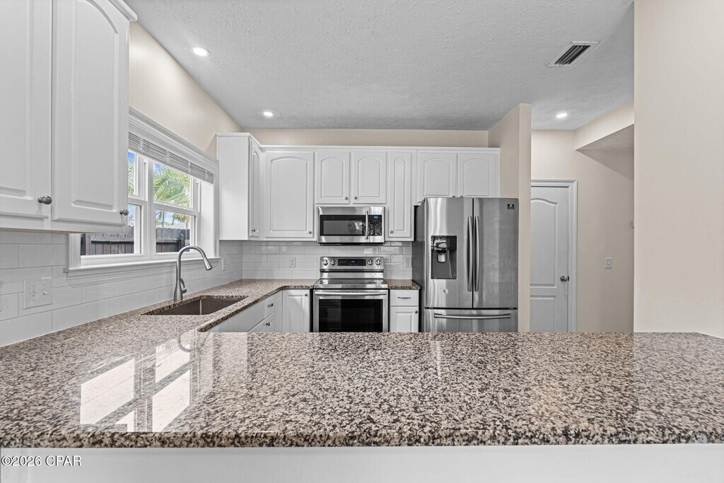 Welcome to this beautiful pet friendly 4-bedroom, 3-bath home located in the desirable Hidden Pines Subdivision! Tucked away on a quiet cul-de-sac, this home offers the perfect mix of comfort, convenience, and modern upgrades. Inside, you'll find a spacious kitchen with granite countertops, stylish backsplash, and stainless steel appliances, perfect for cooking and entertaining. The home features wood-look plank tile throughout the living and wet areas, cozy carpet in the bedrooms, and nicely updated bathrooms. Impact windows and an impact front door provide added peace of mind and energy efficiency. Step outside to enjoy the fully fenced backyard, a screened-in patio ideal for relaxing evenings and a sprinkler system that keeps the lawn looking great year round. Location is hard to beat. Plus, this home offers direct access to a paved walking path to Patronis Elementary and is conveniently located within 10 minutes of the Navy Base, St. Andrews State Park, public beach access, shopping, dining, and more.