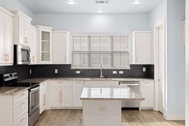 FOR SALE OR FOR LEASE! Former builder's model home loaded with upgrades! This 3 story New England style home in Old Town Lewisville. Features 3 bedrooms, 3.5 baths, an open floor plan, and lots of natural light. The kitchen shines with granite counters, white cabinets, backsplash, farm sink, and smart-home lighting. Enjoy laminate wood floors, custom storage, 10 ft ceilings and an oversized master shower with rain head. Smart home perks include Nest thermostats, Ring doorbell, and Wi-Fi lighting. Walk to restaurants, shops, bars, and parks or relax on your private balcony. First floor guest suite-office, spacious second floor living and dining, and a luxurious master retreat on the third floor complete this stunning home.