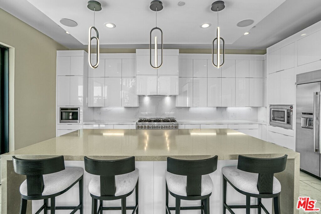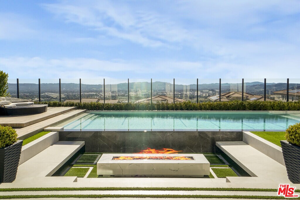 Discover this elevated modern luxury estate set within the prestigious 24-hour guard-gated community of Westcliffe in Porter Ranch Hills. Completed in 2022 and positioned on a premium view lot, this residence captures breathtaking panoramic city and mountain views from nearly every corner of the home including the Primary Suite .A dramatic solid wood and glass entry door opens to soaring 24-foot ceilings and an airy, light-filled floor plan. Expansive windows and oversized stackable doors create a seamless connection between the Great Room, the chef's kitchen, and the outdoor living spaces, flooding the home with natural light and highlighting its sleek modern design.The gourmet kitchen features designer appliances, a large stone island, modern cabinetry, and a generous entertaining space. The main level also includes a spacious Great Room, a versatile office/media room, and a private guest bedroom with a full bath.Upstairs, the Primary Suite offers a luxurious retreat with incredible views, a spa-inspired bathroom with dual vanities, a rain shower, and a soaking tub. Four additional bedrooms and a flexible loft complete the upper level, providing ample room for family and guests. Designed for resort-style living, the backyard is an entertainer's paradise featuring a sparkling pool and spa, a dramatic water-wall feature, a sunken fire pit, and a fully equipped outdoor kitchen with stainless-steel BBQ. Multiple dining and lounging areas, surrounded by manicured landscaping, create the perfect setting for gatherings or private relaxation.Additional highlights include solar panels, high-end finishes throughout, and a three-car garage, rounding out the home's exceptional functionality and design.Ideally located near The Vineyards shopping center, Whole Foods, AMC, award-winning schools, and the 118 freeway, this estate offers modern luxury, elevated lifestyle, and some of the most breathtaking views in all of Porter Ranch! **Furniture included in Guest room, kitchen, living room, dining room & media room** MLS# 25626449