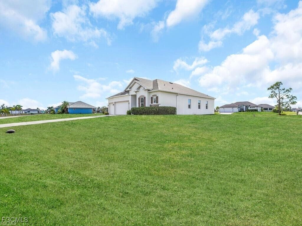 Discover this thoughtfully Modern designed single-family home,built in 2021,featuring approximately 1,995 sq ft of living space in a desirable,quiet NW Cape Coral neighborhood. Property Highlights: Three spacious bedrooms and two full bathrooms paired with a flexible den — ideal for an office,playroom,or formal dining. Bright,open concept living area with 9'-4" ceilings and large windows for natural light. kitchen equipped with stainless steel appliances,granite countertops,and a generously sized island that flows into living areas. Three-car attached garage plus ample lot space (10,498 sq ft) and covered lanai overlooking the backyard – perfect for Florida outdoor living. Modern construction with energy-efficient features,contemporary finishes,and a split-bedroom layout for added privacy. Excellent location near shopping,dining,schools and the expanding Pine Island Road corridor; no HOA for added flexibility.