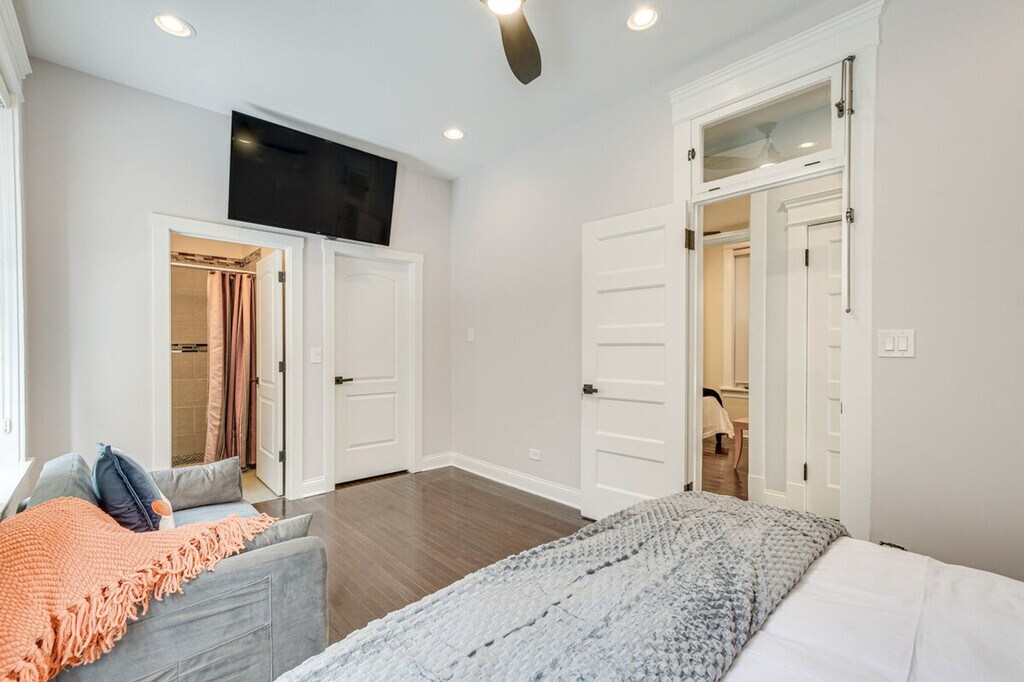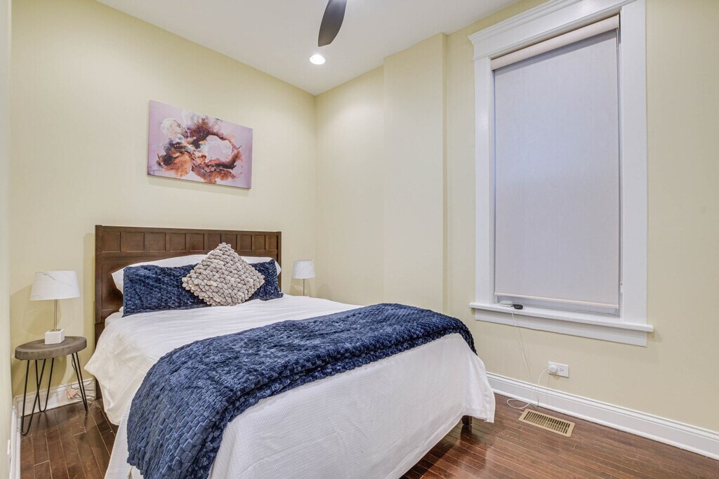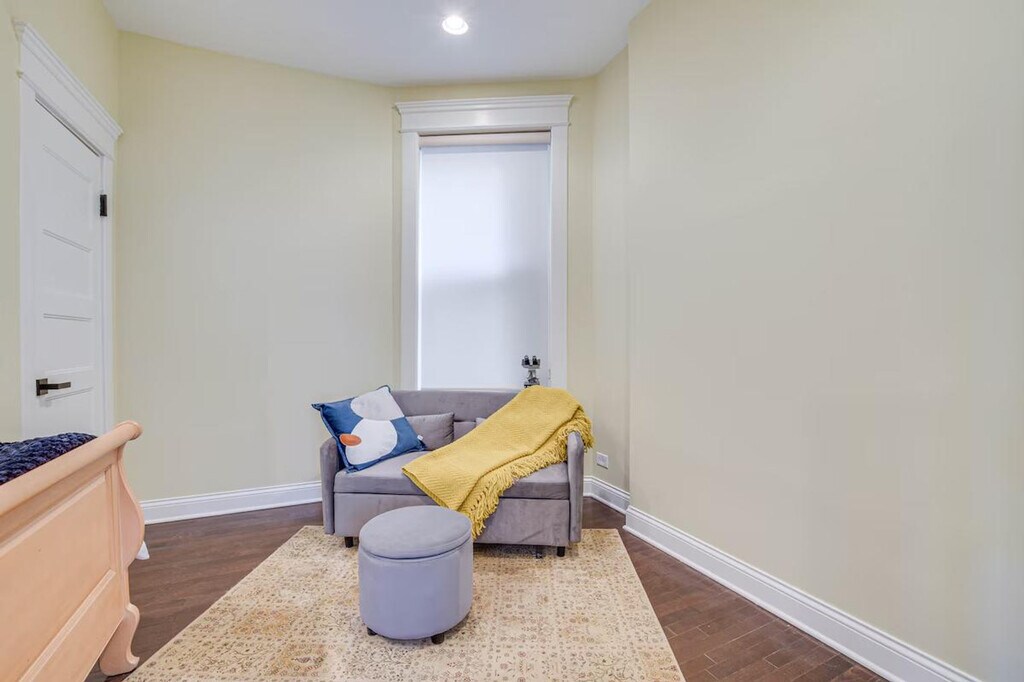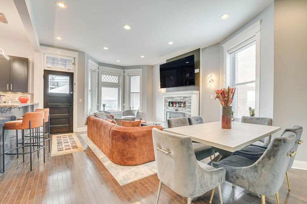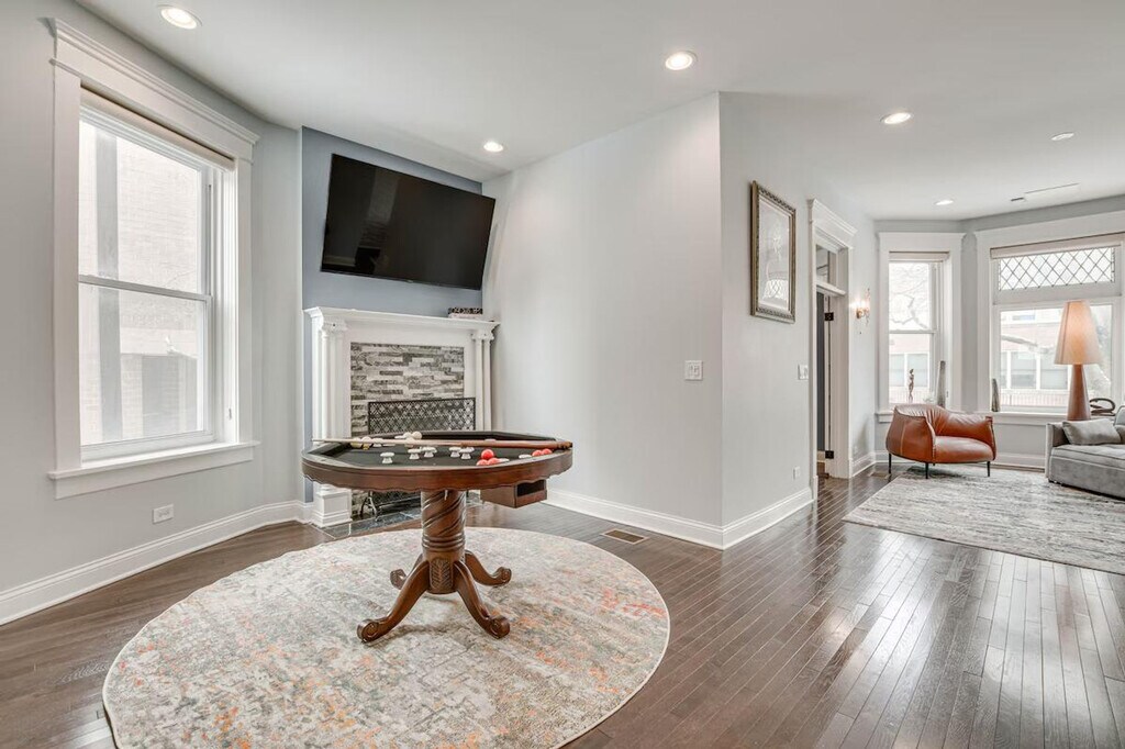 Spend your stay in the Windy City in style at this spacious 3-bedroom, 2-bathroom apartment located just 3 miles from downtown Chicago. This single-story apartment is located on the 1st floor and requires an exterior staircase to enter. Feel at home in this tastefully updated apartment. This apartment is stocked with all of the in-home amenities you need to feel pampered. It features smart TVs with Netflix, HBO Max, YouTube TV and Disney+, board games, a bumper pool table, a card table, multiple living areas, and fireplaces. The kitchen includes cooking basics, a Keurig coffee maker, a Bartesian cocktail maker, a blender, a dishwasher, an air fryer, a pressure cooker, a knife block, a wine fridge, and dishware and flatware. Other amenities include complimentary toiletries, linens and towels, central heating and air conditioning, an in-unit washer and dryer, an iron and board, a hair dryer, laundry detergent, trash bags and paper towels. Enjoy the gas grill with propane provided and street parking with 1 parking pass provided. A pack 'n Play is available for additional sleeping. Enjoy a vacation rental that's within walking distance of Bulls and Blackhawks game at the United Center and centrally located. When you return home from exploring downtown attractions and museums, warm up around the fire or savor a drink on the private deck. Quiet hours are observed from 8:00 PM to 8:00 AM. This property features 2 external security cameras that actively record video and audio when motion is detected. No pets are allowed. No events, parties, or large gatherings are permitted. Registration Number: R2 [SI]