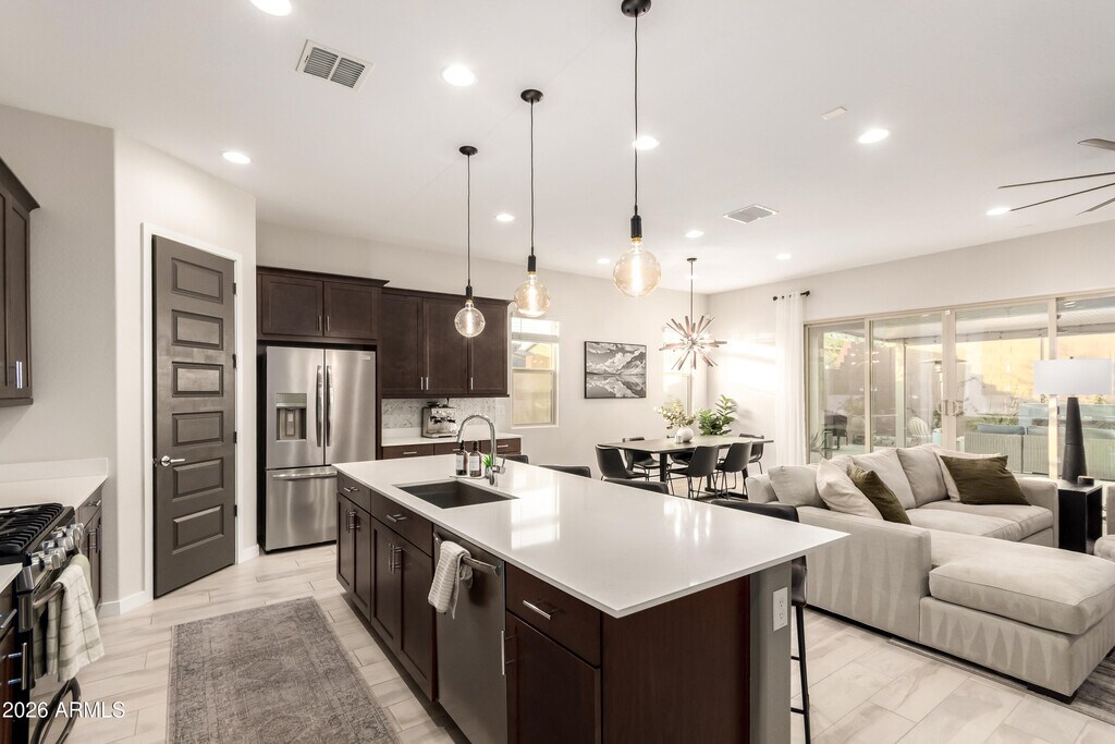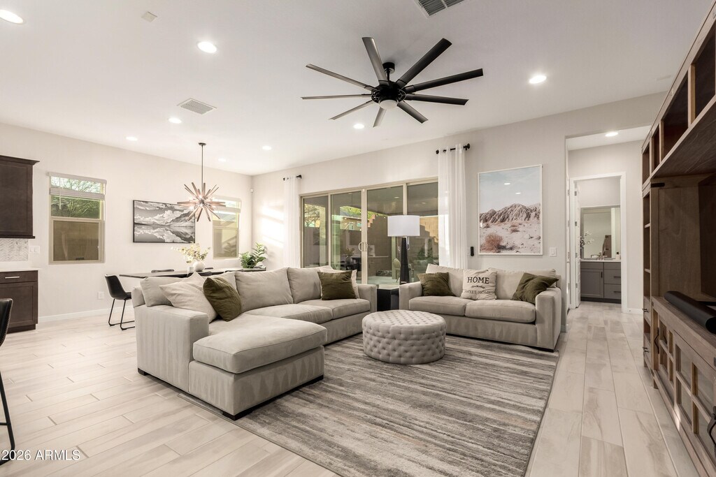 Welcome to one of the most sought-after gated pockets of Sonoran Foothills where thoughtful design,community centric living,and future-forward growth collide. This beautifully upgraded 4-bedroom + den,2.5-bath,3 car garage home spans 2,468 sq ft offering a desirable split floorplan with no neighbors to the left,creating rare privacy in a master-planned community. Inside,you'll find elegant ceramic tile,an open-concept layout,stunning backsplash details,and designer touches throughout including a custom accent wall in the den/flex space,perfect for a playroom,office,or creative studio. Designed for Arizona living,enjoy your own resort-style backyard featuring: Extended patio cover,Limestone pavers,Gas Fireplace - Ideal for evening gatherings or morning coffee. Located in the highly desirable Copperleaf at Sonoran Foothills,residents enjoy a top-rated community center,parks,and walking trails,plus K-8 school within walking distance and quick access to I-17 for effortless commuting. Even better the North Gateway Corridor is booming with new restaurants,retail,and major development underway,and you're just minutes from the TSMC plant,positioning this home in one of the fastest-growing and most future-focused areas of North Phoenix. Homes like this with privacy,upgrades,lifestyle amenities,and location are rare. Don't miss your opportunity to secure one of Copperleaf's most compelling offerings.