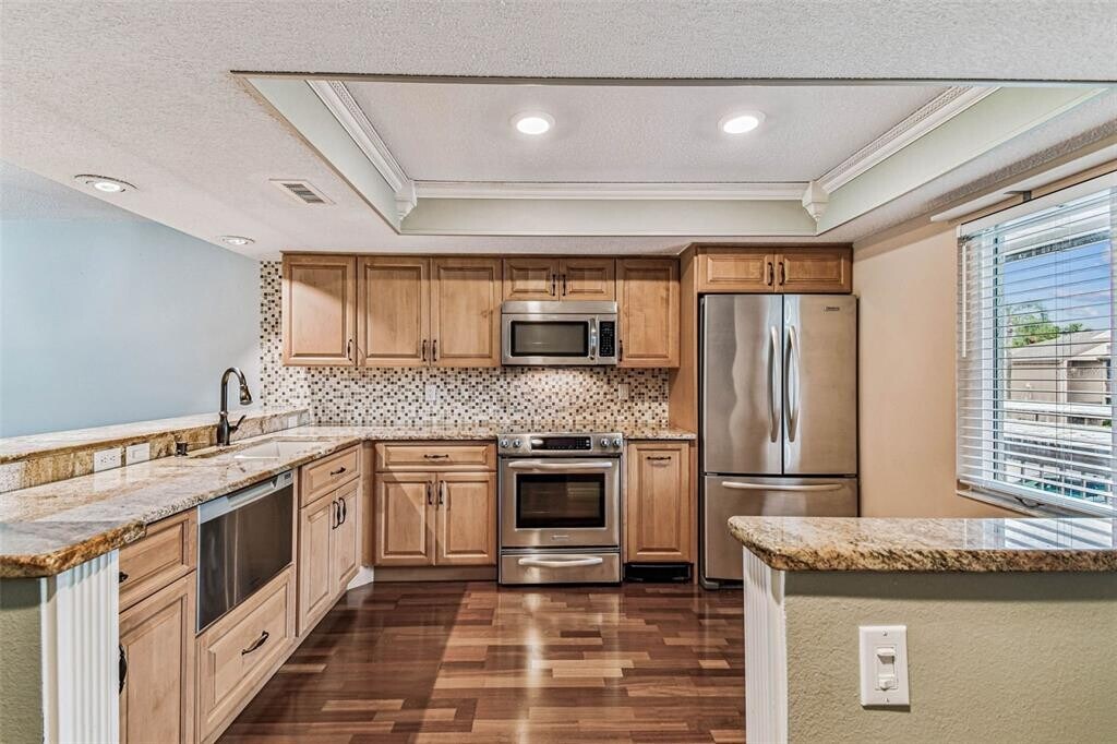 An absolute must see!! Beautifully maintained 2 bedroom,2 bath condo nestled in sought after East Lake Woodlands! Second floor unit offers light,bright spacious living. The home boasts a modern kitchen with updated real wood cabinetry,granite counters and high end appliances. A convenient breakfast bar opens the kitchen to the living area offering optimal entertaining space! Fabulous updated Brazilian oak flooring flows throughout the main living area. The primary bedroom offers 2025 new flooring and closets galore… a large walk in closet and extra storage side closet as well as a second walk-in closet found in the beautiful,updated ensuite. The second bedroom also boasts two large closets and is situated perfectly for guests or a home office flex space. Living and entertaining space is extended to a screened patio with fashionable tile flooring and a custom fitted shade for ultimate privacy. Perfect setting for morning coffee or afternoon cocktails. The patio also houses a convenient laundry closet. Peace of mind is secure with hurricane rated windows throughout and energy efficiency is assured with a 2024 new HVAC system! East Lake Woodlands is a gated community offering marvelous amenities including a lovely community pool,clubhouse and walking trails. The location is within the gates of the East Lake Woodlands Ardea Country Club and accessible to golf courses,shopping,dining and of course the famed Gulf Beaches are nearby! Splendid,well-kept home and carefree living in a sought-after community… better hurry! MLS# TB8449791