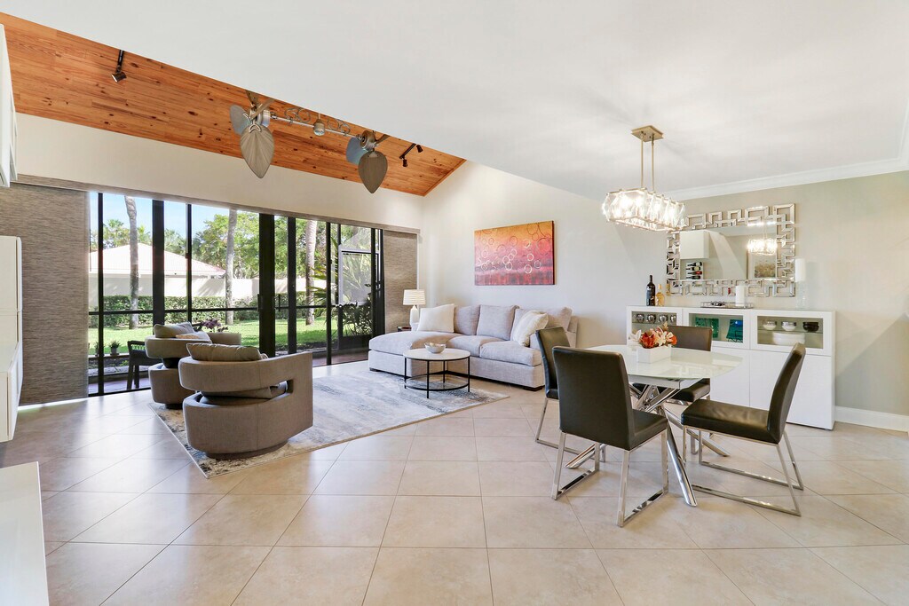 Experience the ultimate in luxury in this exquisitely designed furnished home. This residence boasts sophisticated furnishings and decor,creating an elegant living experience in the sought-after PGA National community. Enter through the private patio to discover a beautifully crafted 2-bedroom,2-bathroom layout spanning 1,491 square feet. Every detail has been thoughtfully considered,with upgraded lighting fixtures that illuminate and enhance the space's charm. The kitchen is equipped with sleek stainless steel appliances,and the open floor plan seamlessly extends to a screened lanai,offering a tranquil outdoor retreat. A 1-car garage provides both security and convenience,ensuring your vehicle is well-protected. The ground level bedroom is currently offered as a home office with a queen sized sofa bed. MLS ID B26000035