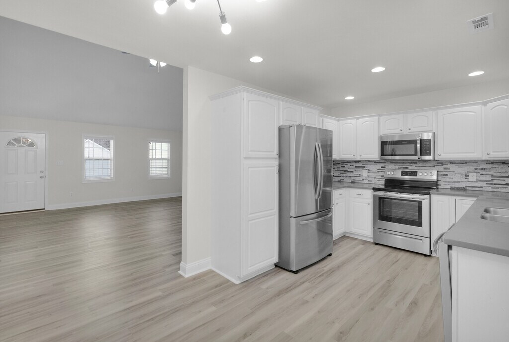 Beautiful 3-bedroom, 2-bath home located in the heart of the town of Newport, just a short drive to MCAS Cherry Point and the Crystal Coast beaches. Featuring high vaulted ceilings and LVP flooring throughout for easy cleaning, the kitchen boasts stainless steel appliances, ample cabinet space, plenty of lighting, stylish countertops, and a striking backsplash. Enjoy relaxing on the covered front porch or entertaining on the covered back patio, which also includes a shed in the backyard. The split layout offers privacy with two bedrooms and a full bathroom on one side and the master suite on the other, complete with a private bathroom and large walk-in closet. Washer/dryer hookups are conveniently located in the laundry closet. The home also includes a spacious 2-car garage and is ready for move-in! Beautiful 3-bedroom, 2-bath home located in the heart of the town of Newport, just a short drive to MCAS Cherry Point and the Crystal Coast beaches. Featuring high vaulted ceilings and LVP flooring throughout for easy cleaning, the kitchen boasts stainless steel appliances, ample cabinet space, plenty of lighting, stylish countertops, and a striking backsplash. Enjoy relaxing on the covered front porch or entertaining on the covered back patio, which also includes a shed in the backyard. The split layout offers privacy with two bedrooms and a full bathroom on one side and the master suite on the other, complete with a private bathroom and large walk-in closet. Washer/dryer hookups are conveniently located in the laundry closet. The home also includes a spacious 2-car garage and is ready for move-in!