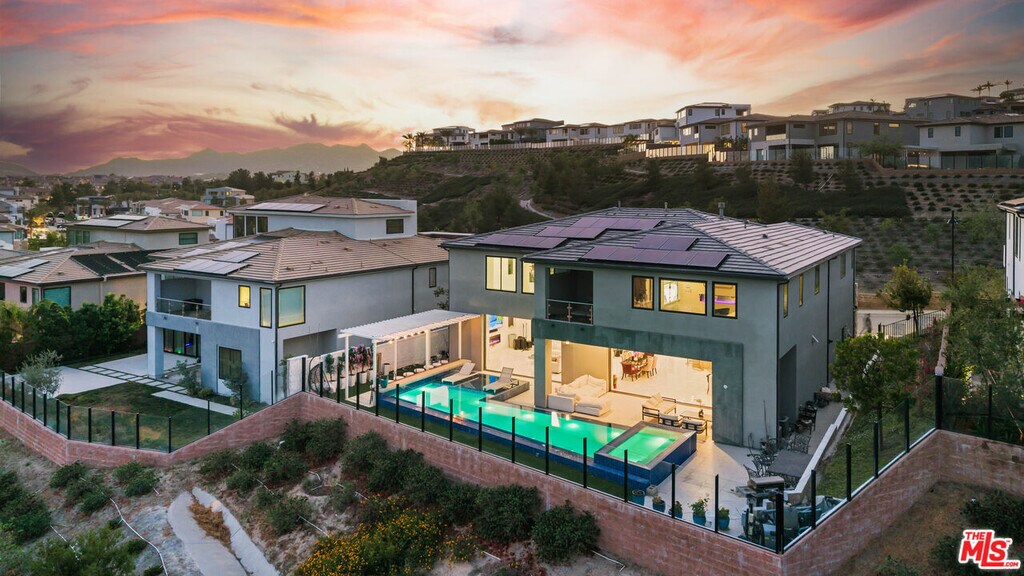 Experience Luxury Living in the Heart of Porter Ranch. Nestled behind the gates of one of the Valley's most coveted guard-gated communities, this WESTCLIFFE Cascades Collection home offers a rare opportunity to live in luxury with unmatched panoramic views of Los Angeles. Step inside through a sleek modern entry and take in the open-concept design, where clean sightlines draw your attention south toward truly spectacular VIEWS! A soaring 23-foot ceiling fills the space with natural light, highlighting elegant designer chandeliers that serve as stunning focal points throughout. The entertainer's wet bar, featuring luxe glass countertops, leads seamlessly into the chef-inspired kitchen complete with high-end stainless steel Jenn-Air appliances, open seating, and a spacious dining area. Indoor/outdoor living takes center stage with expansive patio seating, ideal for hosting unforgettable gatherings against the backdrop of the city skyline. Enjoy a waterfall-edge pool, spa, outdoor BBQ area, and bar-top seating perfect for al fresco dining under the stars. Inside, the first level also features a private office, guest bedroom with en suite bath, and a state-of-the-art theater/media room. Smart home features, including two Tesla solar batteries, provide convenience and significantly reduced utility costs, eco-bee temperature control system, and smart wifi control. Upstairs, the spacious loft connects three additional bedrooms and a breathtaking primary suite, complete with sweeping views, a private terrace, spa-style bath with dual vanities, oversized glass-enclosed shower, and a custom walk-in closet. Located minutes from Sierra Canyon School, Whole Foods, the Vineyards at Porter Ranch, top-rated TK8 PRCS, AMC Theatres, and a brand-new 50-acre park. Optional designer furnishings may be included in lease. MLS# 25558653