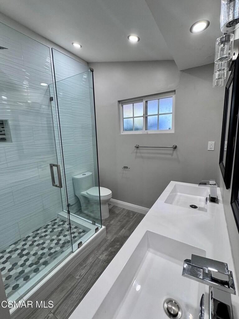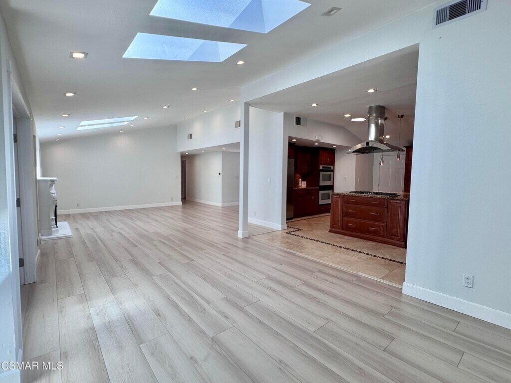 Beautifully remodeled 4 bedroom, 3 bathroom home in prime neighborhood in Woodland Hills. This spacious one story boasts a bright open floor plan, a large kitchen with stainless steel appliances, granite countertops, custom cabinetry, center island and open to dining room. The living room has a garden view, elegant fireplace and sky lights. Primary bedroom has high ceilings, garden and pool views, large en-suite bathrooms with separate shower and soaking tub and plenty of closet space. The home has a second ensuite bedroom with remodeled bath, and walk in shower. Newer laminate flooring throughout. Spacious back yard with low maintenance artificial grass and a large private pool, recently re-plastered. Located within close proximity to freeway, Westfield shopping center and parks.