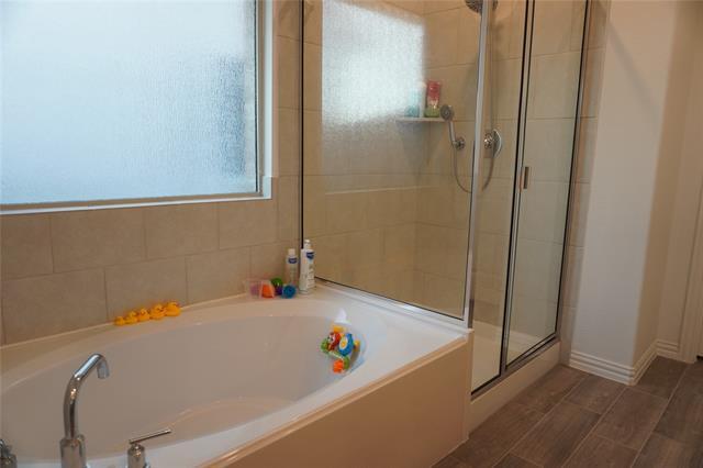 Welcome to a rare leasing opportunity in the highly sought-after Lakewood Hills community, where modern design, comfort, and convenience come together beautifully. This stunning one-story home offers 4 spacious bedrooms, 3 full bathrooms, and a dedicated study, all thoughtfully laid out in a bright, open-concept floorplan filled with natural light. The heart of the home is made for both everyday living and effortless entertaining, with the kitchen, living, and dining areas seamlessly connected. The designer kitchen is a true showstopper, featuring a large island, custom vent hood, stylish backsplash, upgraded hardware, and a walk-in pantry, perfect for hosting or enjoying a quiet night in. The living room is warm and inviting with a gas log fireplace, while the modern color palette and upgraded finishes throughout add a touch of sophistication. Retreat to the spacious primary suite, complete with a spa-like en suite bathroom offering a soaking garden tub, separate walk-in shower, dual vanities, and a generous walk-in closet. Step outside to enjoy a covered patio and a great-sized backyard, ideal for relaxing or entertaining year-round. Perfectly positioned and zoned to highly rated Memorial STEM Elementary, this home also offers unbeatable access to Grandscape, The Shops at Legacy, and Lake Lewisville, putting top-tier dining, shopping, and entertainment just minutes away. Plus, the highly anticipated HEB is coming soon just down the street! Available for move-in beginning April 15, 2026