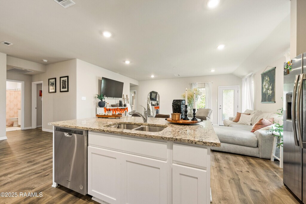 Situated on the largest waterfront lot in the subdivision, this 4 bedroom, 3 bathroom home with an office offers a tranquil country setting just minutes from I-10 and a short drive to Lafayette's best spots. When entering the home, you're greeted with a spacious, open living area perfect for your family and for entertaining guests. The living room boasts lots of natural light, laminate wood floors, and a great view of the spacious yard and pond. The kitchen is complete with granite countertops, stainless steel appliances, tiled backsplash, a walk-in pantry and additional island seating. The master suite features an oversized bedroom, a vanity spacious enough for two, a large soaker tub, and a walk-in closet that's sure to ''wow' you. Other great features include large bedrooms, washer/dryer/refrigerator remain, a video doorbell, and an extended patio. Call your Realtor today to view this home in person!