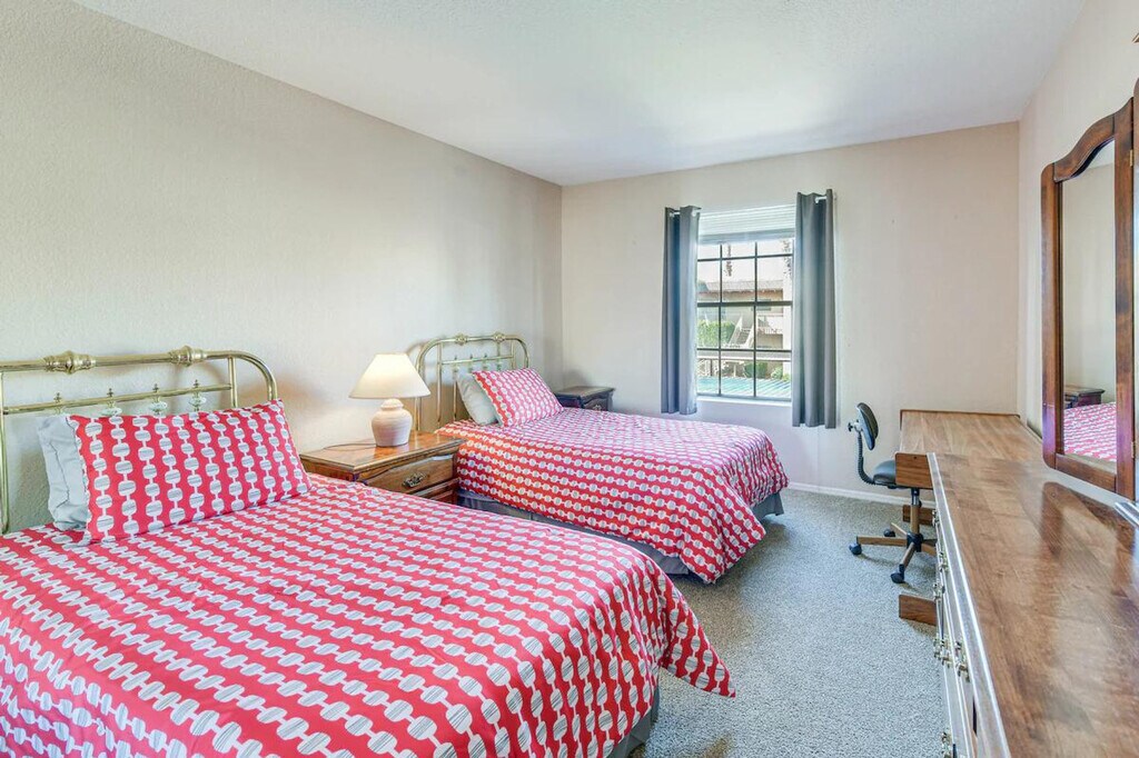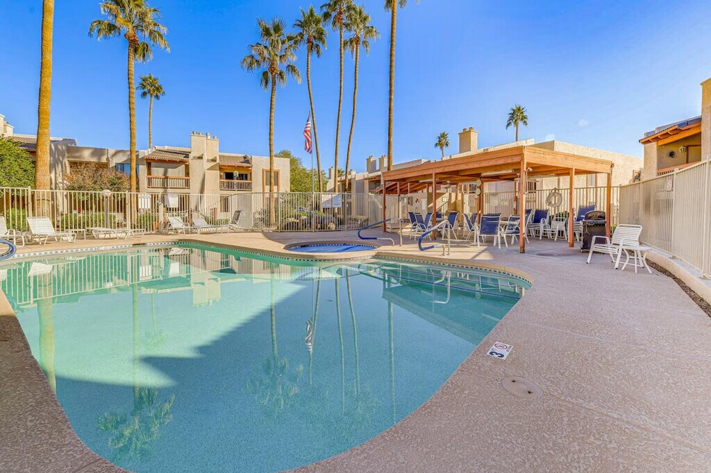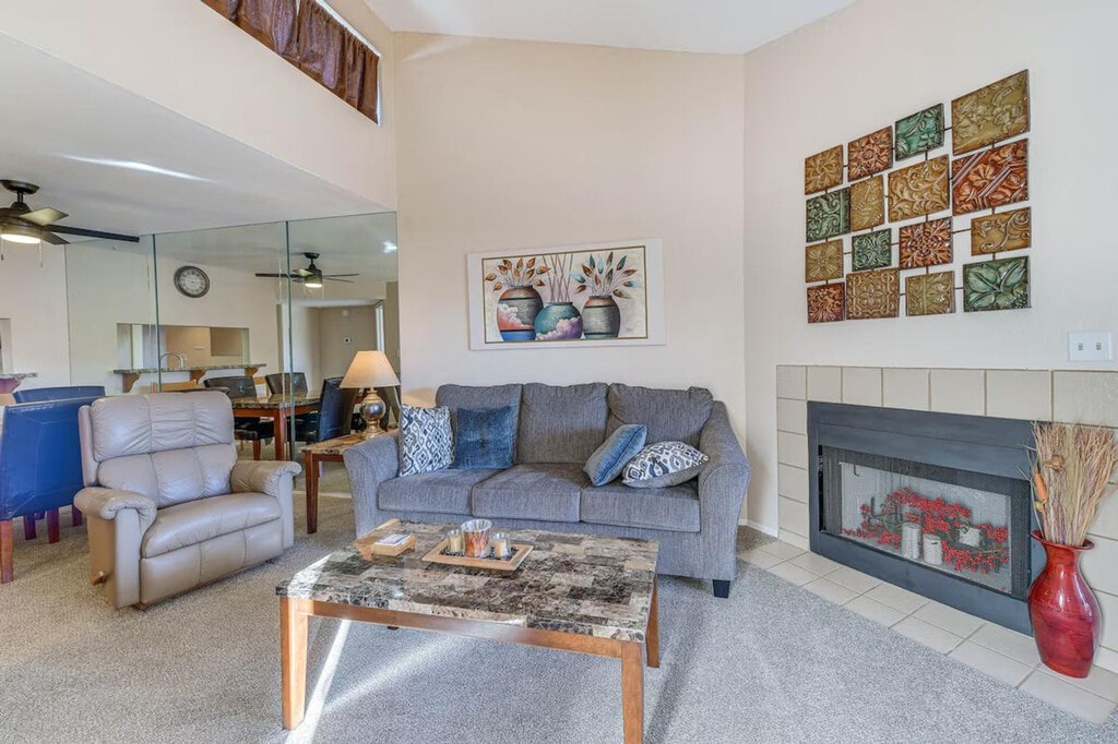 Feel at home in this inviting 2-bedroom, 2-bath condo in Mesa. Located on the second floor of a building that requires using an exterior staircase to enter, this single-story condo offers a memorable desert escape. This condo makes it easy to feel at home with comforts like a full kitchen and an in-unit washer and dryer. It features a smart TV with cable and Netflix, an outdoor dining area, a desk workspace, a decorative (non-functional) fireplace, a walk-in closet, a dining table, and an open floor plan. The kitchen is equipped with a drip coffee maker, dishwasher, microwave, stove/oven, dishware and flatware, ice maker, refrigerator, spices, toaster, Crockpot, and cooking basics. Free Wi-Fi, central air conditioning and heating, linens/towels, a hair dryer, an iron/board, keyless entry, starter laundry detergent, and starter trash bags/paper towels are provided. Carport parking is available for one vehicle, and ample open parking is available in the community parking lot. Spend your days relaxing by the community's pools and hot tubs, enjoying the Arizona sunshine at Red Mountain Park, or visiting attractions like the Arizona Museum of Natural History. Enjoy a delicious dinner al fresco on one of the property's 2 private balconies. Downtown Phoenix is 25 miles away. Smoking or vaping is prohibited, including on the balconies or front porch. No pets, events, parties, or large gatherings are allowed. Additional fees and taxes may apply, and a photo ID may be required upon check-in. Includes a desk workspace. [SI]
