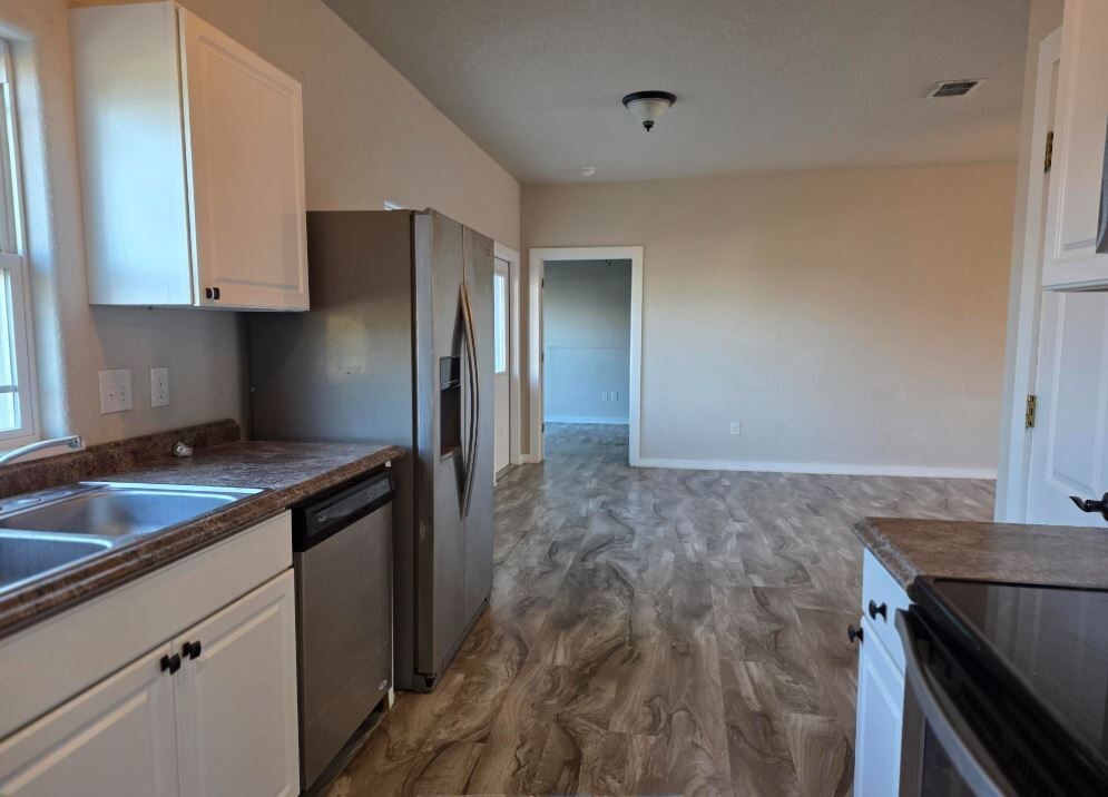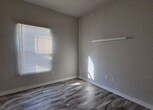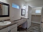 FOR LEASE!! Welcome to this inviting 2-bedroom, 2-bath home featuring a bright and open layout with a popular living, dining, and kitchen floor plan. Painted concrete floors and 9-foot ceilings run throughout the home, creating a modern and spacious feel. The split-bedroom design offers added privacy, while the master suite includes a walk-in shower, double vanities, generous counter space, and roomy closets. The kitchen features Formica countertops and comes complete with a furnished refrigerator. Enjoy a small, easy-to-maintain yard with a covered back patio that stays shaded in the afternoons—perfect for relaxing outdoors. Additional features include a storage closet in the garage.