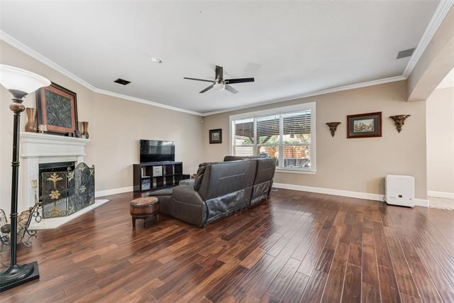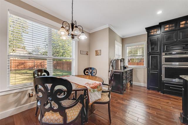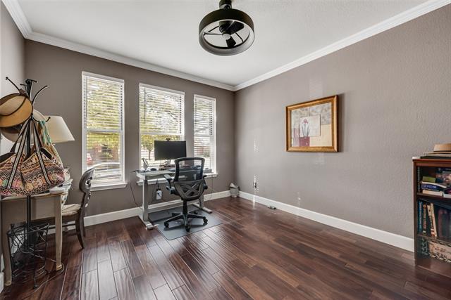 Beautiful two-story home located in the desirable Northwest ISD. This well-maintained residence features all bedrooms upstairs, including a spacious primary suite with a full bath and walk-in closet. Two additional bedrooms share a second full bath. The main floor offers an open living and dining area, a functional kitchen, and a private office with great natural light—ideal for remote work. A half bath is conveniently located downstairs for guests. Enjoy the rich hard wood flooring, crown molding, and modern finishes throughout. Step outside to enjoy your private backyard has a covered patio—perfect for morning coffee, playtime, or weekend gatherings. Located near schools, shopping, and dining with easy access to major highways.