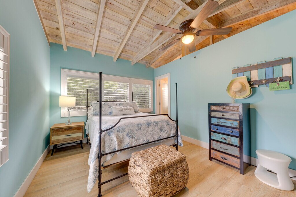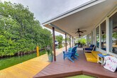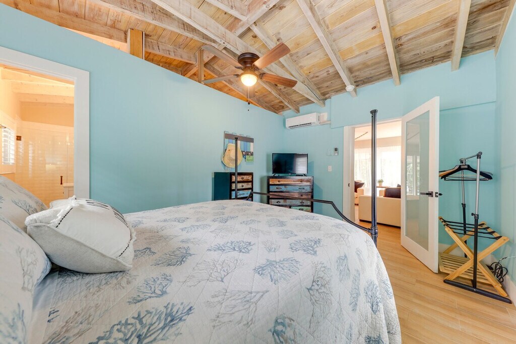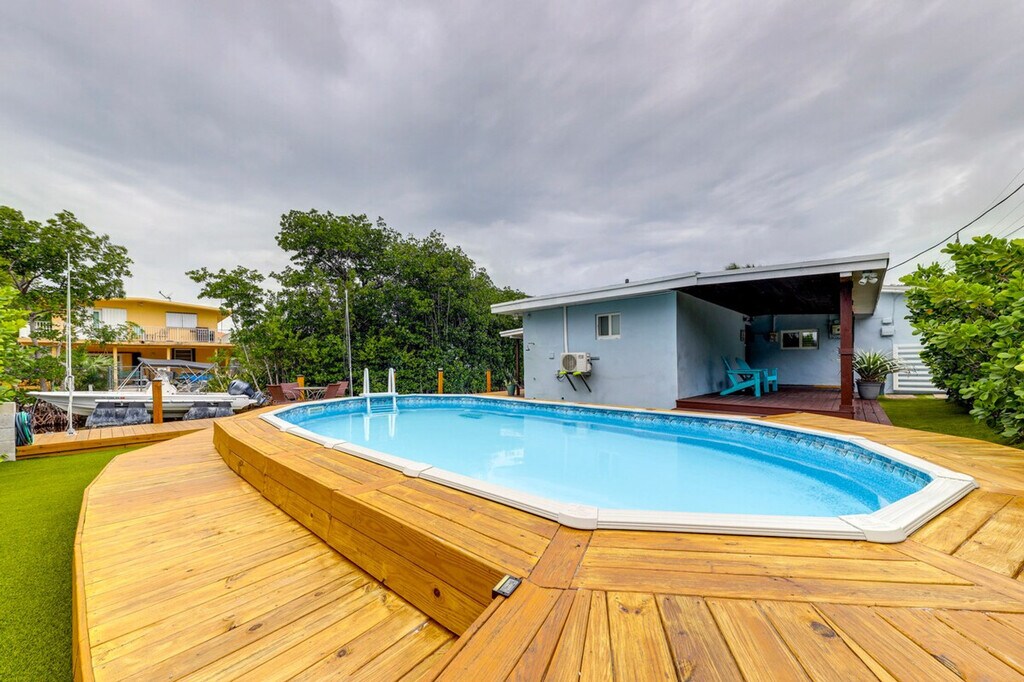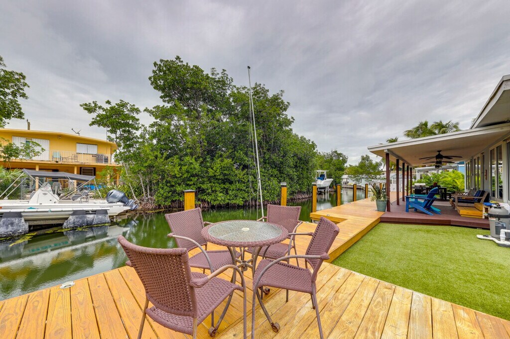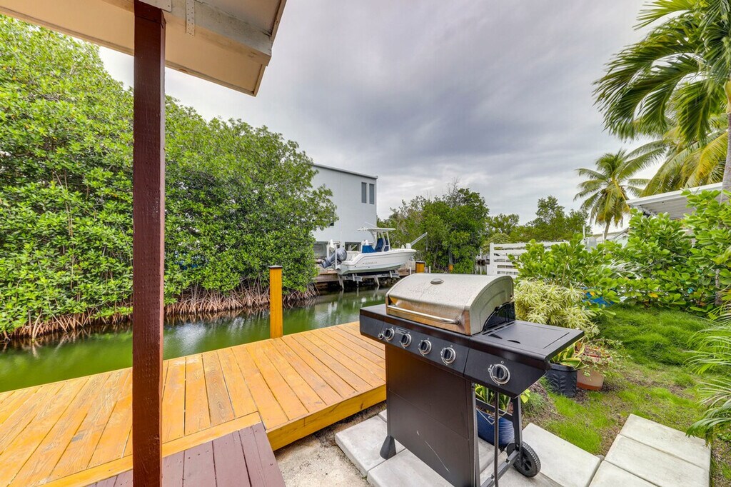 Feel at home in this coastal 2-bedroom, 2-bathroom vacation rental in the Florida Keys, offering stunning canal views and a relaxing island vibe. Enjoy the convenience of a single-story home with just one step required for entry. Unwind by the private pool or on the spacious deck, perfect for sunset viewing and soaking in the serene water and mangrove views. This thoughtfully designed apartment features modern coastal decor, cable TVs in each room, and ceiling fans to keep you comfortable. The fully equipped kitchen includes stainless steel appliances, a 4-burner range, microwave, fridge, cooking basics, dishware, flatware, toaster, spices, and a breakfast bar with stools. A drip coffee maker is also available, though coffee is not provided. Pets are welcome with a $300 fee plus taxes and fees. Parking is available in the driveway for one vehicle, with additional street parking on a first-come, first-served basis. Located in the heart of the Florida Keys, this apartment offers easy access to local attractions, shops, and restaurants. Venture out to dive and snorkel the nearby coral reefs or enjoy waterfront dining with a gas grill on the private deck. The neighborhood is perfect for exploring the natural beauty of the area. This property is pet-friendly with a $300 fee and prohibits smoking, events, parties, or large gatherings. Guests must be at least 25 years old to book, and additional fees and taxes may apply. A photo ID may be required upon check-in. Enjoy keyless entry for convenient access to the entire property. Stay connected with free WiFi throughout the apartment, making it easy to work remotely if needed. [SI]