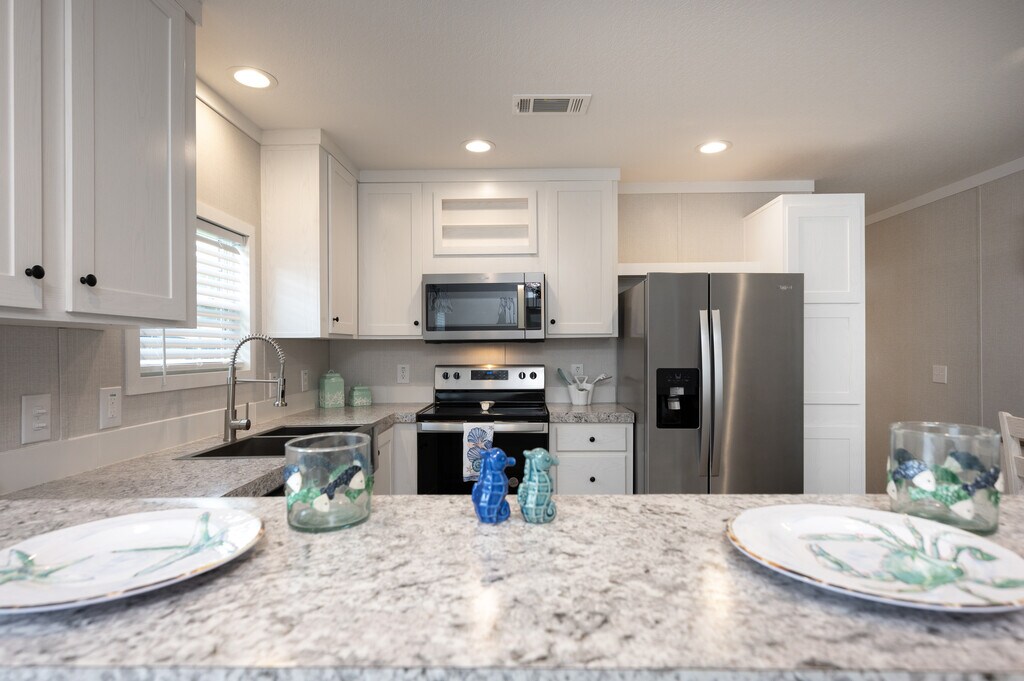 **Make This Charming NEW Home Yours & Golf FREE for 1 Year** This 2023 Fleetwood 810 sq. ft., 2 bed/2 bath home has a comfortable living space with a 6-foot front porch to sit and relax while drinking your coffee. It features stainless steel appliances, a farmhouse sink with a gooseneck spring faucet, tile backsplash, laminate counter tops, and beautiful linoleum flooring throughout.