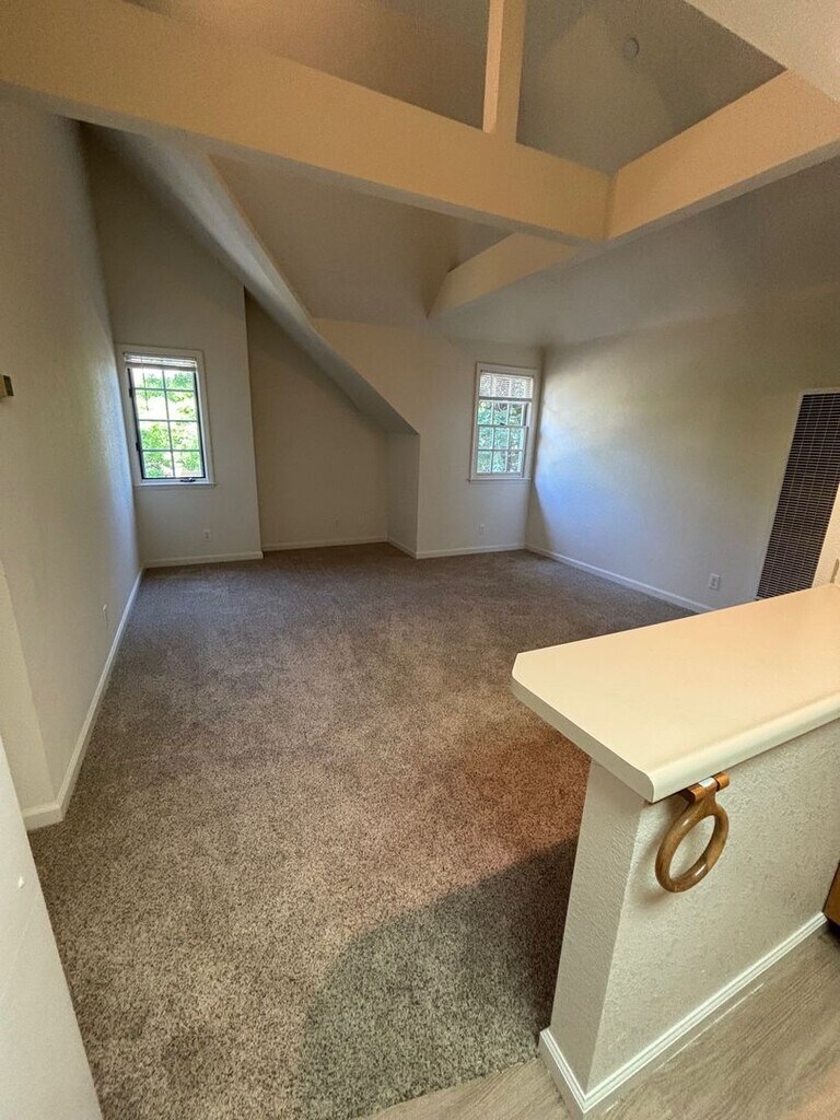 This upstairs 1 bedroom 1 bathroom junior ADU is located in Northeast Santa Rosa and just minutes to downtown and freeway access! It features a large carpeted living room with exposed beam high ceilings. The kitchen features a gas stove, microwave and refrigerator (provided but not warranted). The carpeted bedroom features high ceilings and lots of natural light. The bathroom has a single vanity and tub/shower combo. Wall heater. Detached 1-car garage with washer and dryer included (provided but not warranted). Water, garbage and landscaping included. Cat negotiable. Sorry no dogs or cosigners. 1 Year Lease (MT) Placement