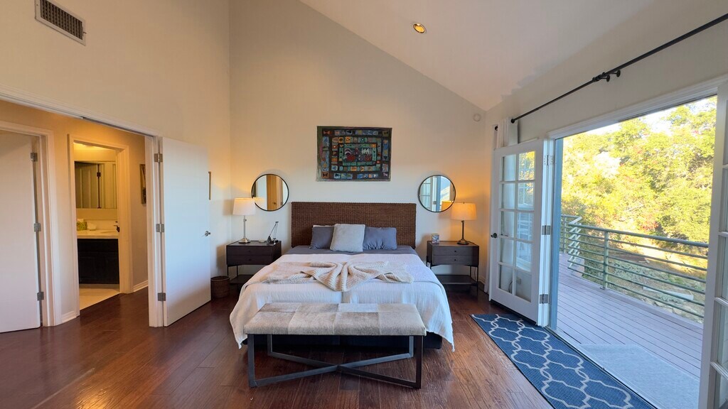 Furnished short term rental in Topanga’s climate perfect Fernwood Pacific neighborhood, available for stays of 1 to 6 months. This private 3 bedroom plus loft, 2 bathroom home sits on about 1.5 acres of nature conservancy with sweeping canyon and mountain views, a large entertaining deck, solar heated pool, hot tub, small vineyard and hillside trails. Inside, an open floor plan with high ceilings, antique wood floors, a stone wood burning fireplace and a gourmet kitchen creates a warm, comfortable space to relax or work from home. The loft works well as a media room, office or extra bedroom, and the primary suite offers two walk in closets, a spa tub and French doors that open to the view deck. A separate 400 square foot studio apartment below the main home, with its own kitchenette including refrigerator and microwave, is available for an additional 1,500 dollars per month and works well for guests or workspace. Pool, hot tub and all outdoor areas are shared with two small occupied rental units on the property. Garage parking with EV charger and all utilities are included at 6,000 dollars per month for the main house, or 7,500 dollars per month with the studio. Pets are considered on a case by case basis. Just minutes to both the Palisades and Malibu beaches.