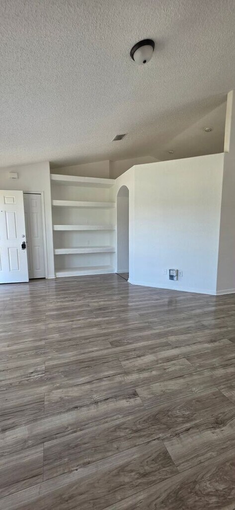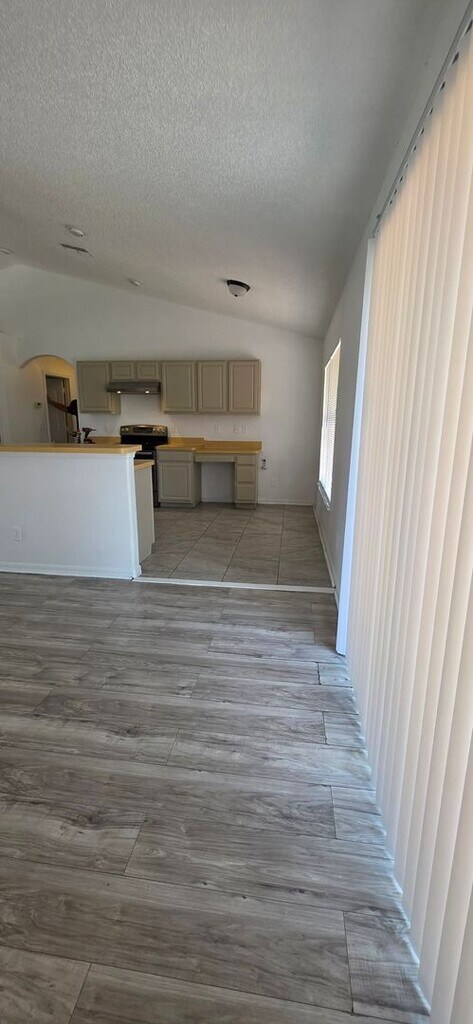 This spacious 3-bedroom, 2-bath home offers a functional layout with over 1,700 square feet of living space. The open living and dining area features high ceilings and plenty of natural light, creating an airy feel throughout the main living spaces. The kitchen includes ample cabinet and counter space, a pantry, and a convenient breakfast bar that overlooks the living area. Tile flooring runs through the kitchen and bathrooms, while the main living areas feature wood-style flooring for easy maintenance. The primary suite includes a walk-in shower and generous space, while the additional bedrooms are well-sized and versatile for guests, office space, or family needs. Additional features include: 2-car garage Indoor laundry area Split floor plan for added privacy Large sliding glass doors providing natural light
