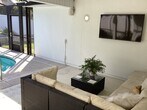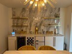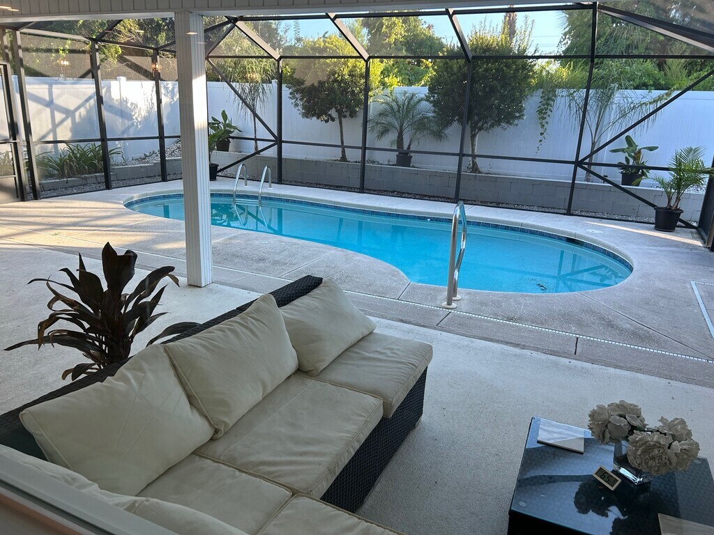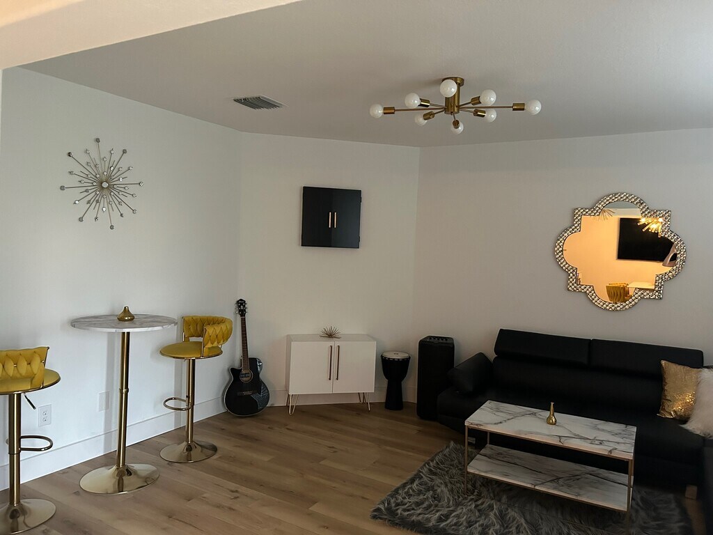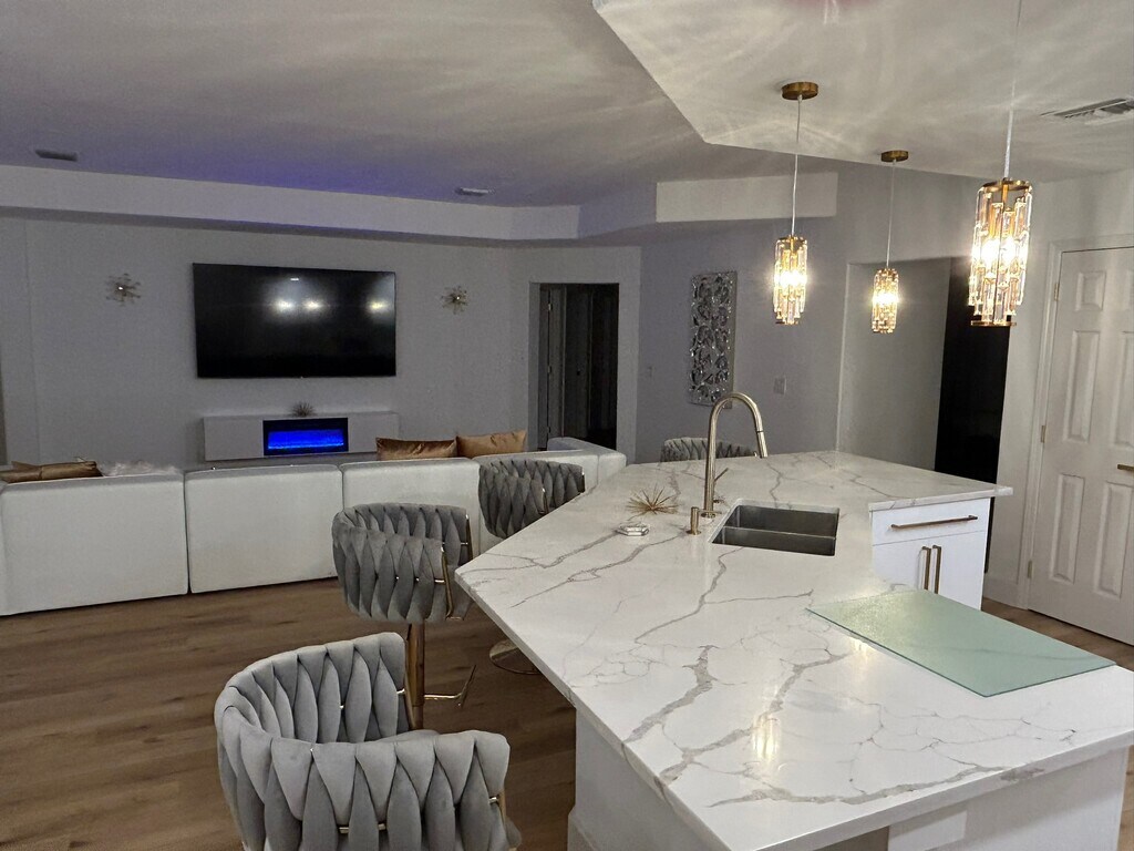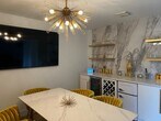Gorgeous furnished home with pool eight blocks from the beach. Fully remodeled in mid-century glam. Three bedroom, two bath plus bonus room and an open floor plan with an 85" TV, plus 6 other TVs. It has a separate family/music room and a built-in bar in the formal dining room. Beautiful marble tile master bathroom with Jacuzzi, large primary, den, and guest room. Elegant backyard with a pool, built-in bbq, lounge area, tv, and speakers. The pool faces west for maximum sun exposure. Across the street from Pier Park which has several bars, restaurants, movie theater, shopping, and a large ferris wheel. Located on the west side of Panama City Beach with only a 10-minute drive to Rosemary Beach and fine dining.