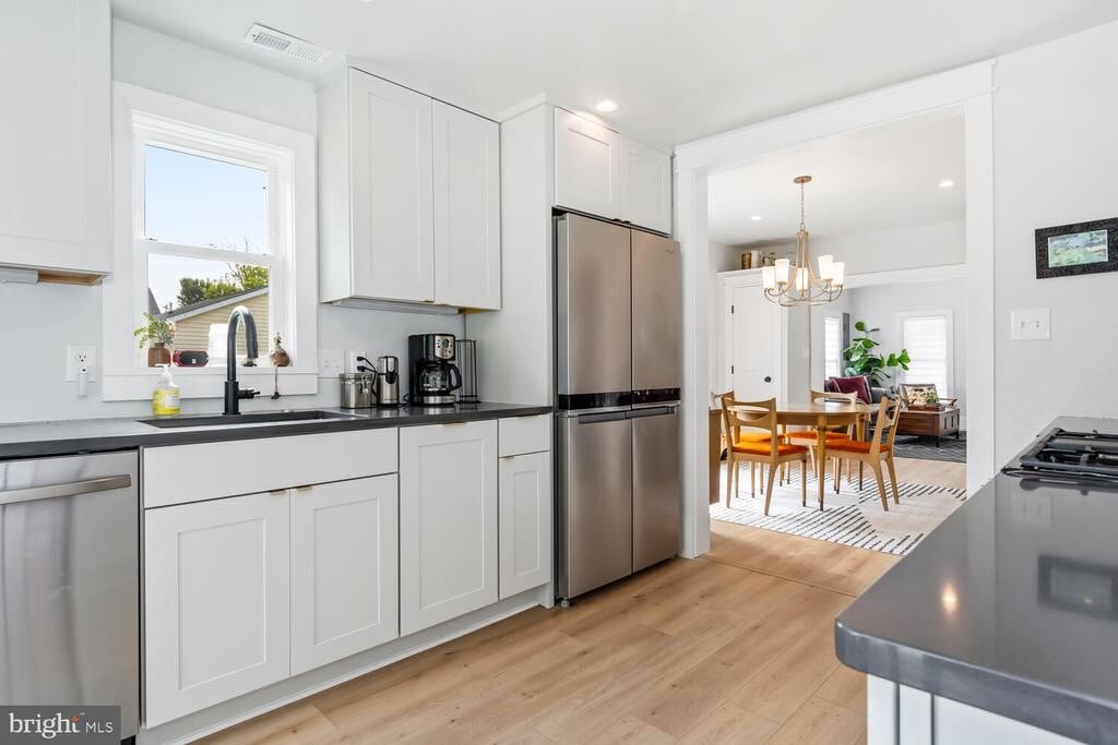 Fabulous 1910 Bungalow with welcoming front porch that has been renovated throughout.  All main level living with beautiful primary suite offers room for king bed and ample closet space. Primary tiled bath offers luxury walk-in shower with sliding glass doors.  Corner guest room with pocket door leading into guest bathroom. Living room has vaulted ceiling with skylight and opens to spacious dining room with great closet space and sliding glass doors to large side yard. The open eat-in kitchen offers painted maple cabinets, stainless steel appliances, cultured stone counter tops, sliding door to backyard and walk-in laundry room. This amazing home sits on a large fenced lot allowing for future addition and possible  garage. Blonde wide plank engineered flooring throughout. Propane on-demand hot water and cooking. This home is being offered for a minimum 4-month rental period but a longer term will be considered.
