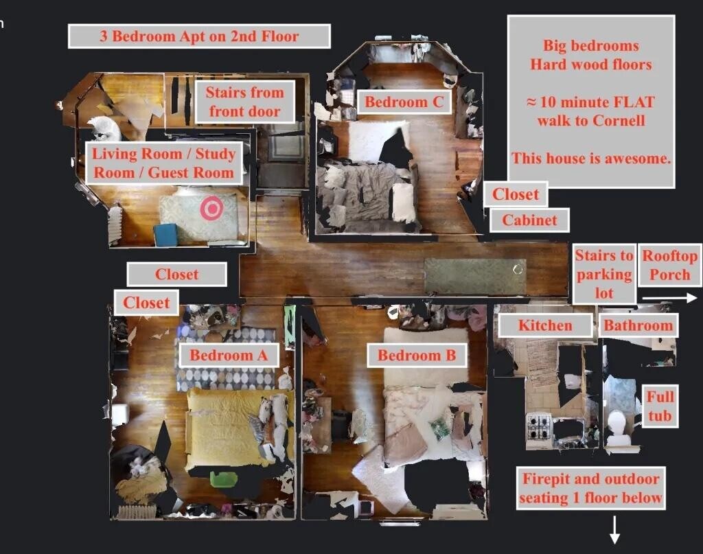 Live in this tree-lined neighborhood super close to North campus. This house is just a 10 minute FLAT walk (without hills!) to Cornell\'s Architecture School and Arts Quad and a 3 minute walk to the Jessup @Triphammer TCAT bus stop. It\'s also just a 13 minute walk to the Ag Quad. Arrive on campus on time for class without breaking a sweat. It is also just an 8 minute walk from the pool and gym at Helen Newman. This location is perfect for people who want to live in a quiet neighborhood close to Cornell University and also have a large yard to enjoy. Off-street parking spaces are rented out just behind the house. You can roast s\'mores with your friends outside in the fall around the shared propane fireplace. Relax on the bluestone patio on comfy outdoor furniture and BBQ on the grill. There are shared laundry machines right inside the house basement. Heat and water are already included in the rent, so you don\'t have to worry about those bills! Want a large bedroom with hard wood floors just a 5 minute FLAT walk from Cornell's North Campus? Rent a room in this 3 bedroom apartment and you will have no hills to climb to get to campus! The Cornell College of Architecture, Art and Planning is just a 10 minute walk from the house, and the Cornell Ag Quad is a 12 minute walk from the 207 Kelvin Place. Arrive on campus on time for class without breaking a sweat. If you want to sweat, the pool and gym of Helen Newman are just a 9 minute walk away from the house. And there's a nice rooftop porch a few steps from the apartment back door, and a nice outdoor space with chairs and a propane-powered fire pit below. $925/person to a group of 3 heat, water, snow removal included + $200/person for annual trash and recycling pickup + electric for the apt. Available August 3, 2026 - July 28, 2027. 12 month lease. Security Deposit and first month rent due upon lease signing. Take a quick virtual tour: