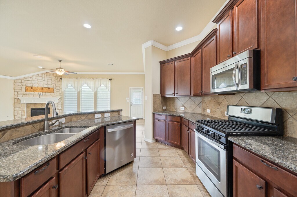 Welcome to this inviting home with a seamless open-concept layout perfect for entertaining and everyday living. The kitchen boasts granite and stone countertops,stainless steel appliances,a spacious pantry,and ceramic tile flooring throughout. Two cozy bedrooms on the left side,a walk-in laundry room with added convenience,high ceilings with recessed lighting,crown molding,gas fireplace,and a striking front door with Lone Star leaded glass. Step outside to an extended covered patio for outdoor relaxation. This move-in ready home offers style,functionality,and thoughtful upgrades for the next chapter. Refrigerator,washer,and dryer included for added convenience. Don't miss out on the opportunity to make this your new home! MLS# 71990107