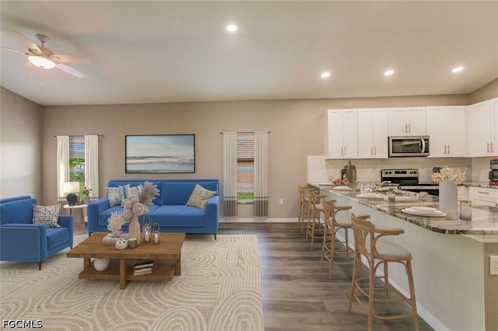 New 4-Bedroom Corner Lot Home with 3-Car Garage in Cape Coral! Be the first to enjoy this nearly new,one-year-old home situated on a desirable corner lot in the heart of Cape Coral. Featuring 4 bedrooms (or 3 plus a study) and 2 baths,this home offers a spacious,modern layout designed for comfortable living and entertaining. Inside,you’ll find elegant 18-inch ceramic tile flooring throughout,42-inch wood cabinets with soft-close features,and stunning granite countertops with a stylish tile backsplash. The kitchen is a standout with upgraded stainless steel appliances,ample workspace,and a large 10-foot breakfast bar perfect for gatherings. Ceiling fans are installed in every bedroom and on the covered lanai,creating a comfortable indoor-outdoor lifestyle. The home also includes a convenient indoor laundry room with washer and dryer. Optional features include a fenced yard for an additional $100/month and lawn care for a minimal fee. Located near shopping,restaurants,and schools,this home combines style,space,and convenience. Multiple homes and move-in dates available—photos shown are of a model home. Call today to learn about exciting move-in incentives!