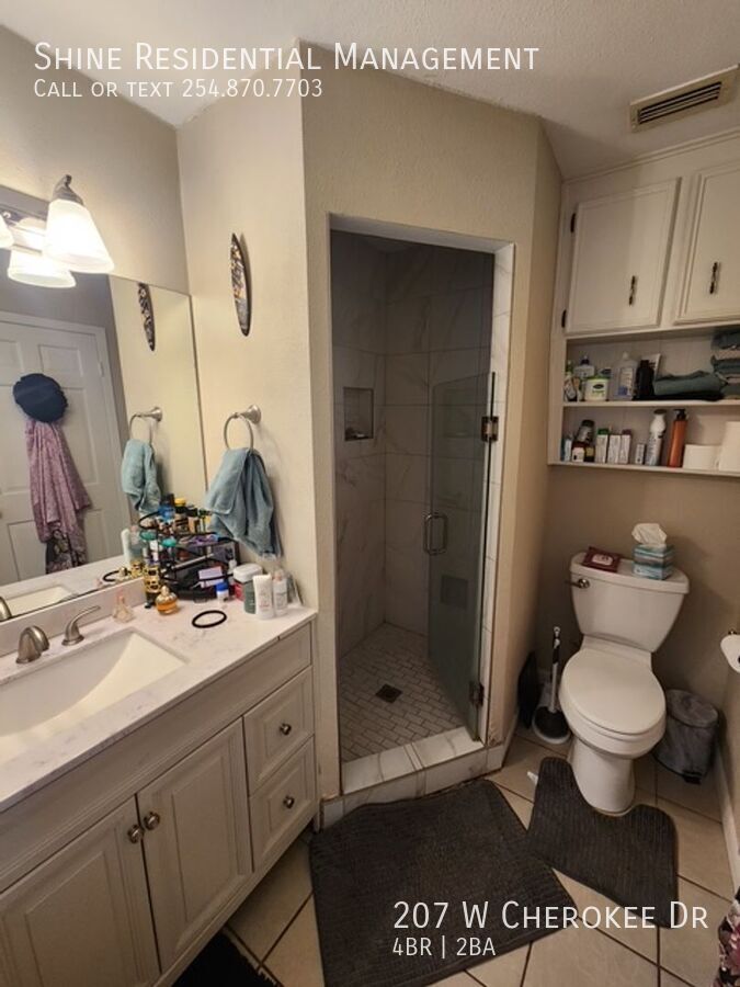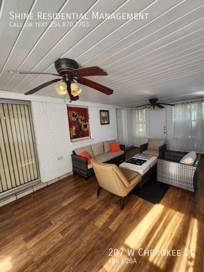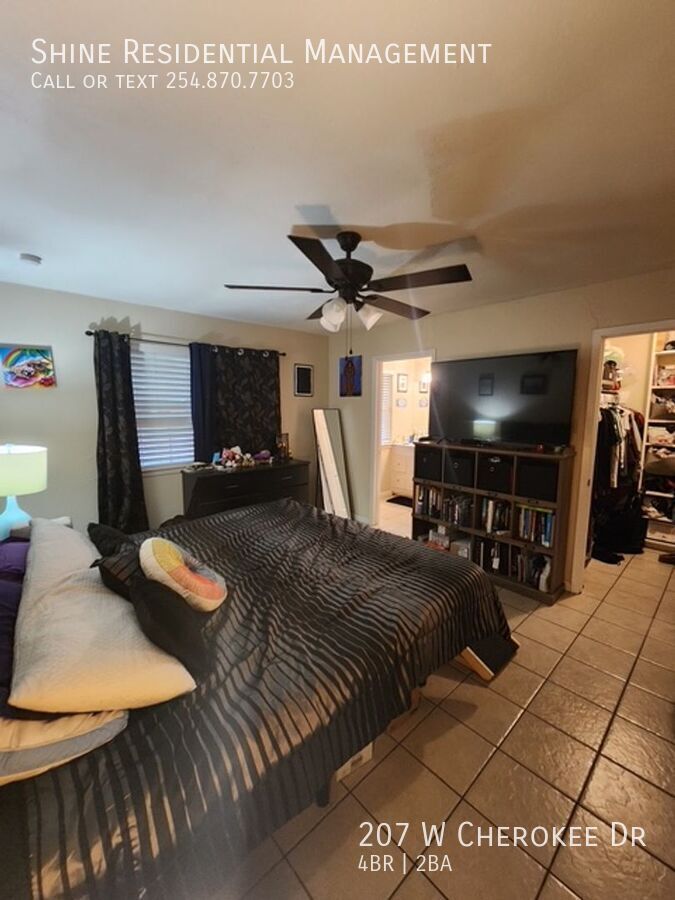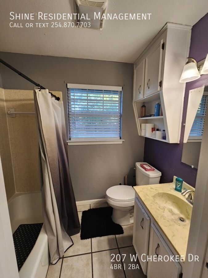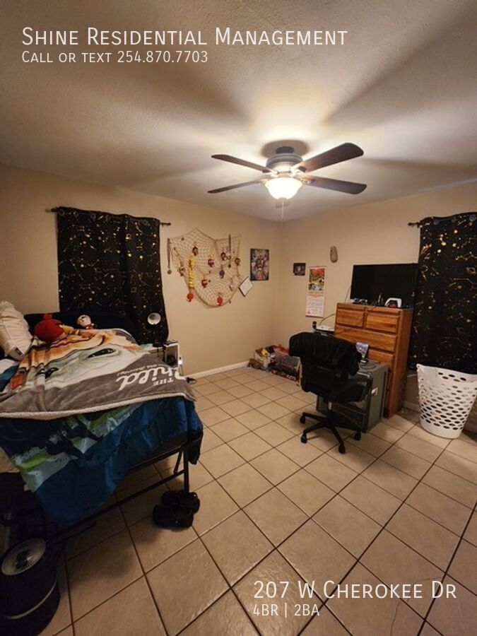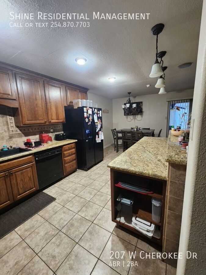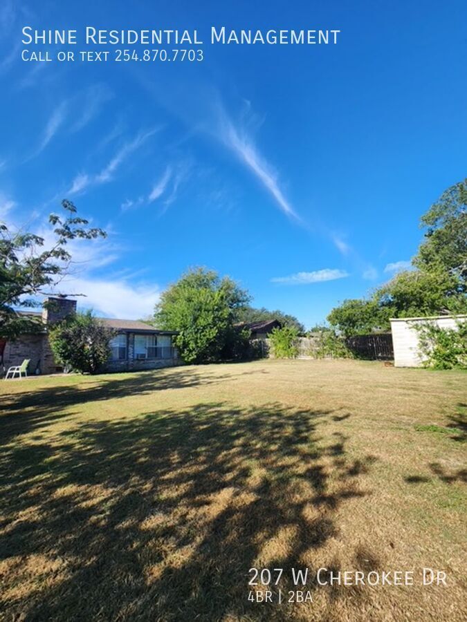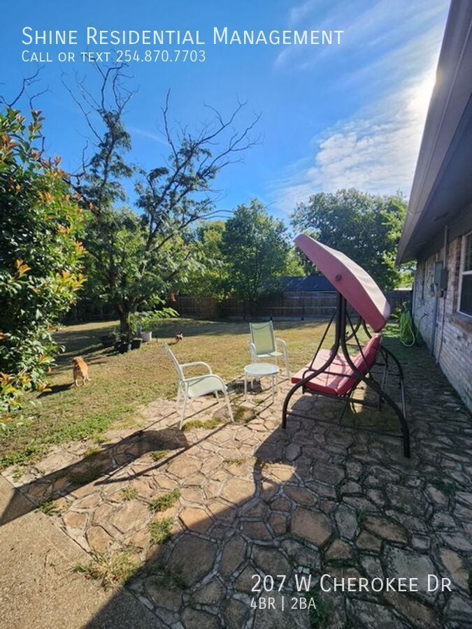 Welcome to 207 W Cherokee Dr, a stunning 4-bedroom, 2-bathroom home located in the vibrant community of Harker Heights, TX. This home is a perfect blend of comfort and modern living, boasting a range of amenities designed for your convenience. The kitchen is a chef's dream, equipped with a dishwasher, microwave, refrigerator, and a stove/oven. It also features upgraded granite countertops, a pantry, and a breakfast bar. The home's interior is accentuated by tile floors, ceiling fans, and black appliances, creating a sleek and stylish look. The spacious living area features a cozy fireplace, perfect for those chilly evenings. The home also includes a large laundry/mudroom with a laundry hookup, and a generous storage space. The bedrooms are a haven of relaxation, complete with walk-in closets and a private bath with a nice shower. The home also features a fenced yard with an enclosed back patio and a sizeable backyard, perfect for outdoor activities. A small storage building is also included. The home is pet-friendly and comes with a garage parking. The air conditioner and climate control system ensure your comfort all year round. With no carpets to worry about, maintenance is a breeze. Experience the best of Harker Heights living at 207 W Cherokee Dr. Air Conditioner Black Appliances Climate Control Enclosed Back Patio Large Laundry/Mudroom Laundry Hookup Linen Closet Mirrors Nice Shower Nice Shower. No Carpets Pet Friendly Private Bath Sizeable Backyard Small Storage Building Storage Space Upgraded Granite Countertops Walk In Closets