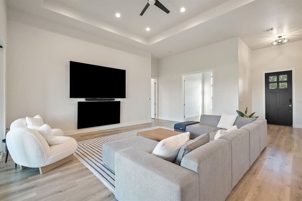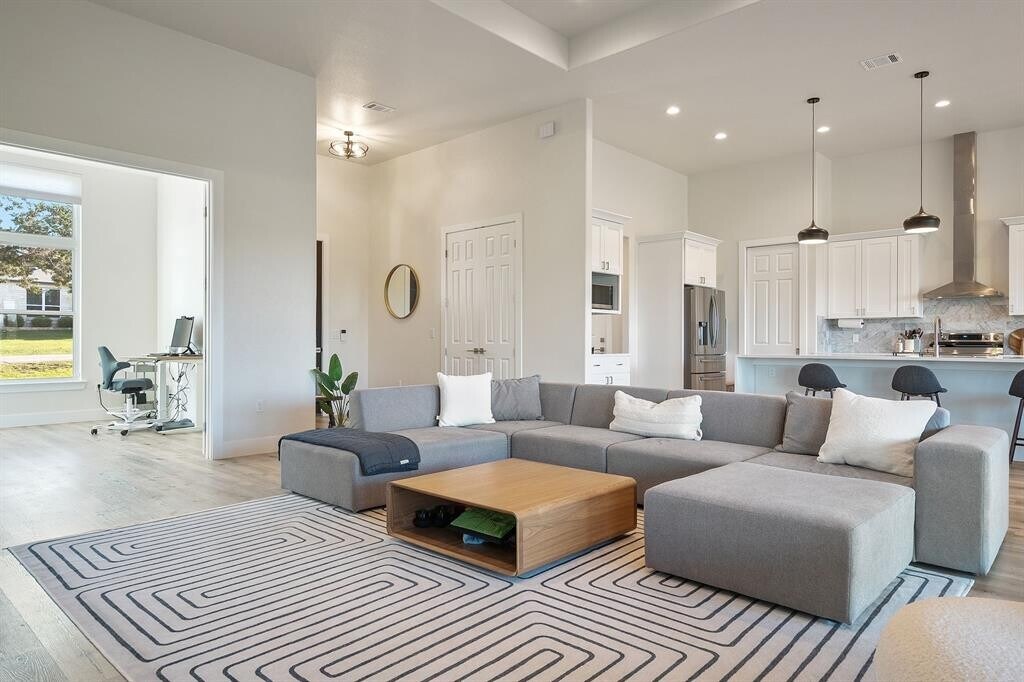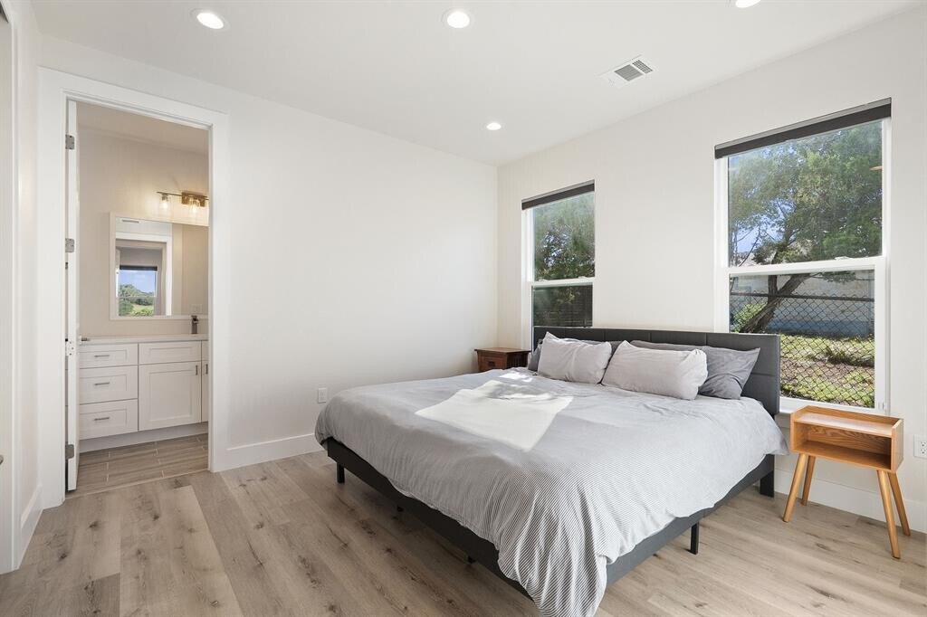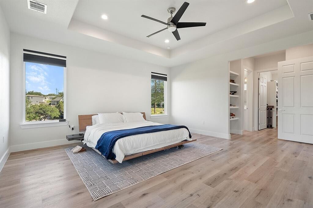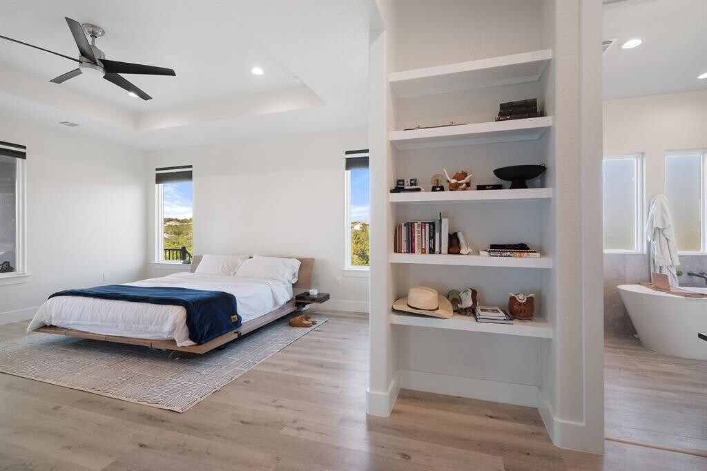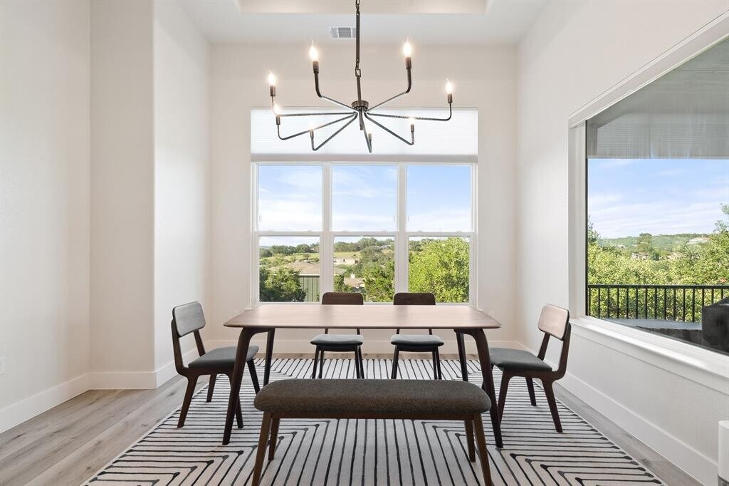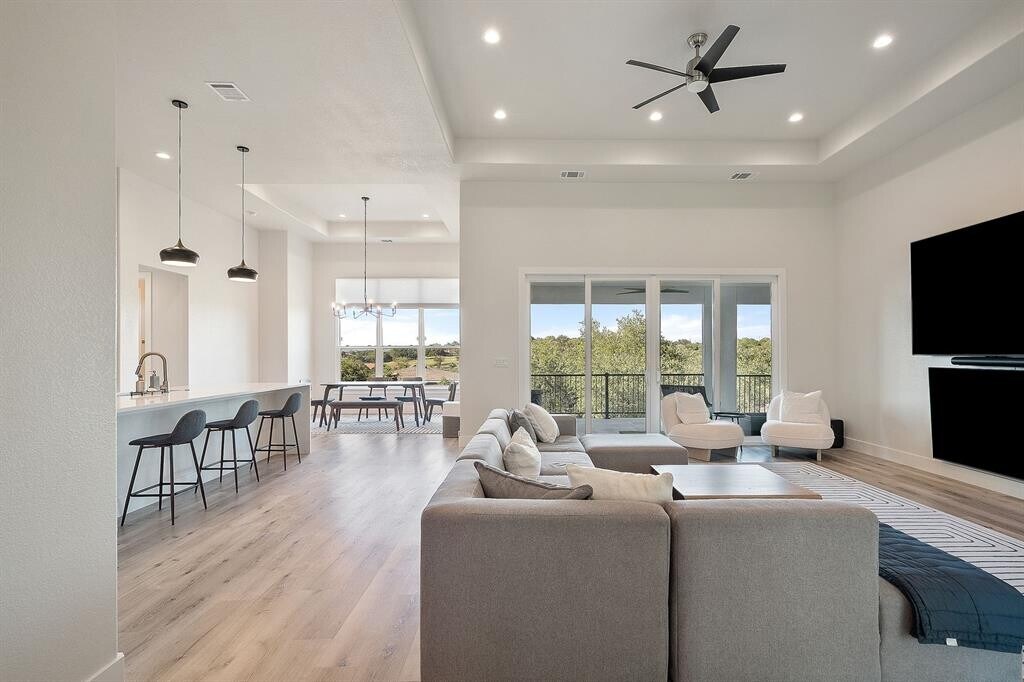 Sweeping views for miles in Lago Vista. A fresh, stellar one-story floor plan with stunning high ceilings and water access awaits you. Elevated with numerous upgrades including a waterfall island, extending the luxury vinyl to each room, epoxied garage, custom window treatments, and beautiful new lighting fixtures, this home brings all the relax-in-luxury vibes to your doorstep. This million-dollar-view home was built for entertaining. With a huge outdoor patio for spectacular panoramic views from the expansive living area and primary bedroom and an extra large yard with plenty of room for a pool and vegetable garden, this open-floorplan home is a standout in every way. Flowing into both the kitchen and dining spaces, the family room measures almost 30x22 ft, opening out onto the sliding door balcony. Large closets for every room abound. Furnished option available. For furnished option, contact agent for more information and pricing details. Be at peace in this private and serene neighborhood, with deer that roam and beautiful rolling hills that take you down toward the water, just minutes away. Enjoy your time on the water as a member of the Lago Vista HOA, with amenities including 9 parks, a campground, marinas, boat ramps, a swimming pool, tennis courts, a fitness center, pickleball courts and so much more. This is truly lake life at its finest.