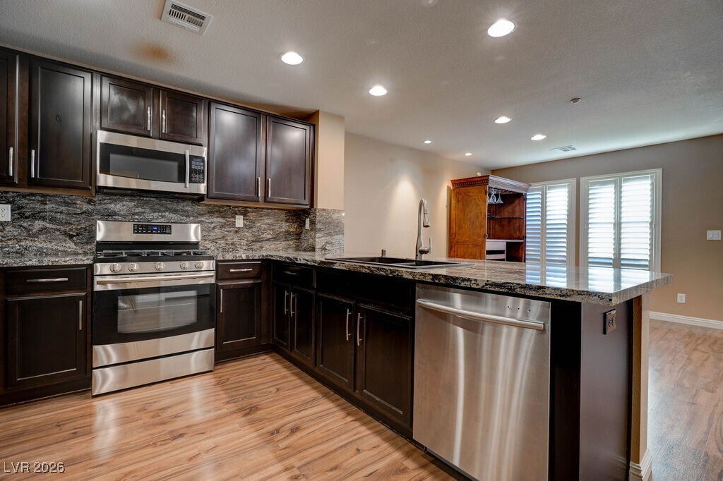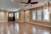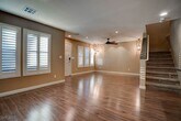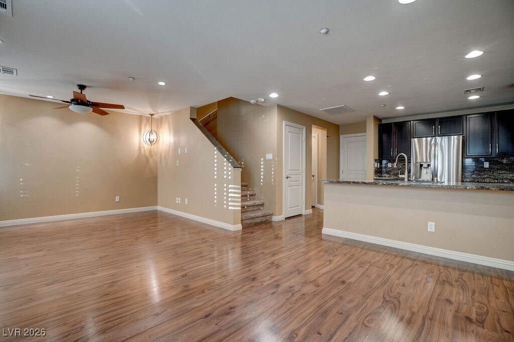 Upgraded townhome located in the desirable Inspirada community. This open-concept home features extra-large stone countertops, stainless steel appliances, and a walk-in pantry—ideal for both cooking and entertaining. Beautiful laminate flooring and upgraded light fixtures enhance the main living area, while a large storage closet under the stairs adds convenience. Upstairs includes a laundry room and an inviting primary suite with a custom walk-in closet and an upgraded primary bathroom. Additional highlights include shutters throughout, central vacuum, water softener, and a finished garage with custom cabinets and epoxy flooring. A must-see home combining style and functionality.