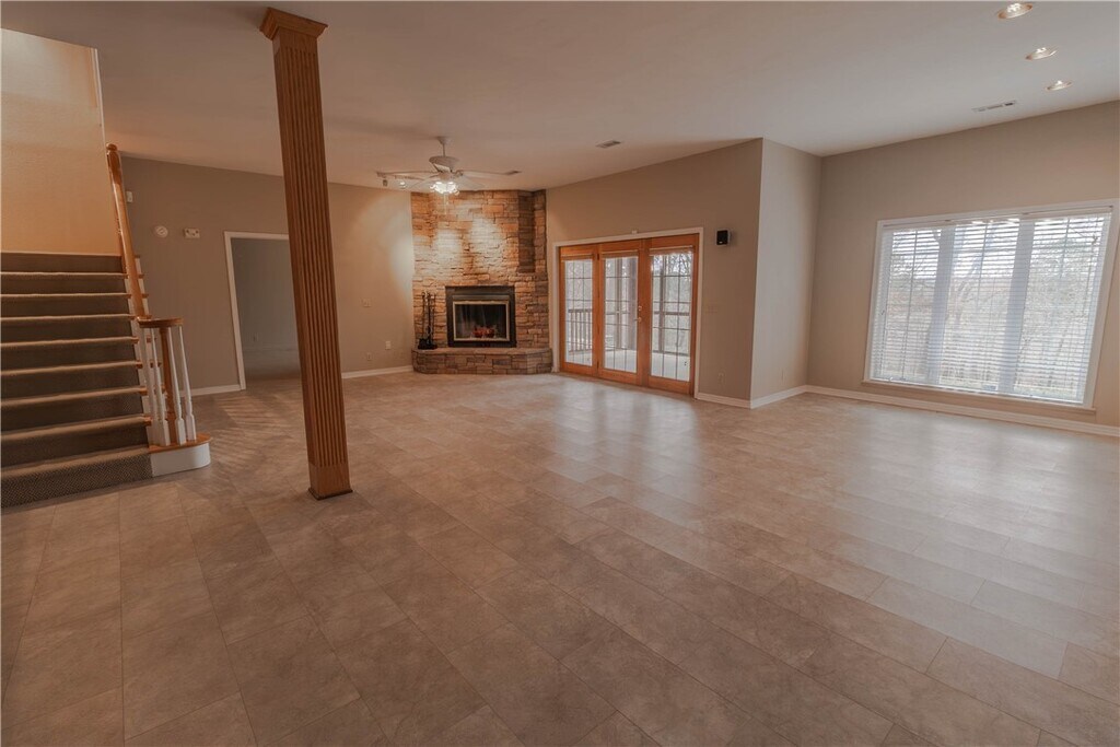 Nestled in the scenic Beaver Lake / Rocky Branch area,this stunning 5-bedroom,3.5-bath home offers the perfect blend of space,comfort,and natural beauty. Set on an expansive 17-acre property with a private gated entry,the home features a thoughtfully designed split-bedroom floor plan,three spacious living areas,and soaring vaulted ceilings that enhance the sense of openness. Enjoy serene wooded views from two sunrooms or unwind on the upstairs deck,all while surrounded by abundant natural light. The luxurious master suite includes built-ins and a private fireplace,creating a cozy retreat within the home. Additional highlights include an oversized two-car garage,whole-home generator system,and included yard care and landscaping for easy living. Conveniently located just around the corner from Rocky Branch Marina,this exceptional property also comes with all appliances provided as a courtesy to tenants,making it a rare and appealing opportunity. MLS ID 1339655