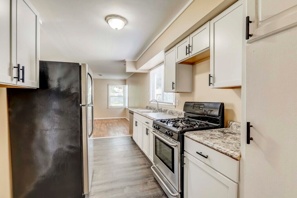 tion Welcome to this bright and inviting home featuring an open,spacious living room with beautiful hardwood floors and plenty of natural light,perfect for relaxing or entertaining. The kitchen offers easy-to-maintain vinyl flooring along with stainless steel appliances,including a stove,refrigerator,and dishwasher,making everyday cooking a breeze. The charming bathroom includes an attractive tub surround and stylish light fixtures for a clean,modern feel. Bedroom one is comfortably carpeted and features a nicely sized closet,while bedrooms two and three showcase classic hardwood flooring for warmth and durability. A dedicated laundry room with vinyl flooring provides convenience and easy upkeep. Step outside to a rear yard ideal for outdoor activities,gatherings,or simply enjoying fresh air,plus a spacious 2.5-car detached garage that offers excellent parking and storage. This home combines comfort,functionality,and space in a quiet