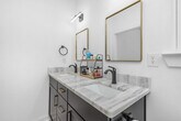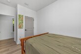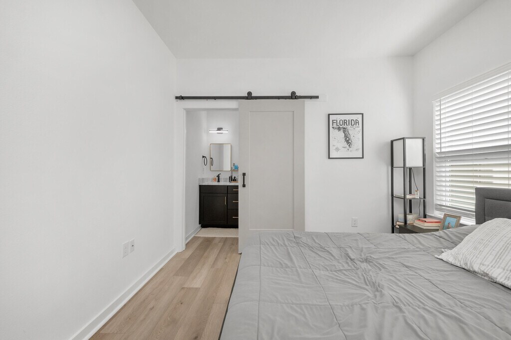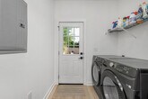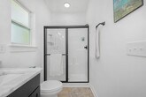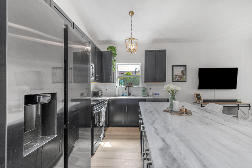 Step onto the covered front porch and into this well-appointed 3-bedroom, 2-bathroom home offering approximately 1,150 square feet of living space. The interior features an open-concept floor plan with high ceilings, abundant natural light, and durable luxury plank flooring throughout.The kitchen is equipped with matte black cabinetry, black stainless steel appliances, granite countertops, a custom backsplash, and a large island that opens to the main living area. The smooth-top range includes rapid-boil functionality and Wi-Fi capability.The primary suite includes a walk-in closet and an en-suite bathroom with double vanity and a glass-enclosed walk-in shower. Additional bedrooms are well-sized with ample natural light. The laundry room is conveniently located near the bedrooms and