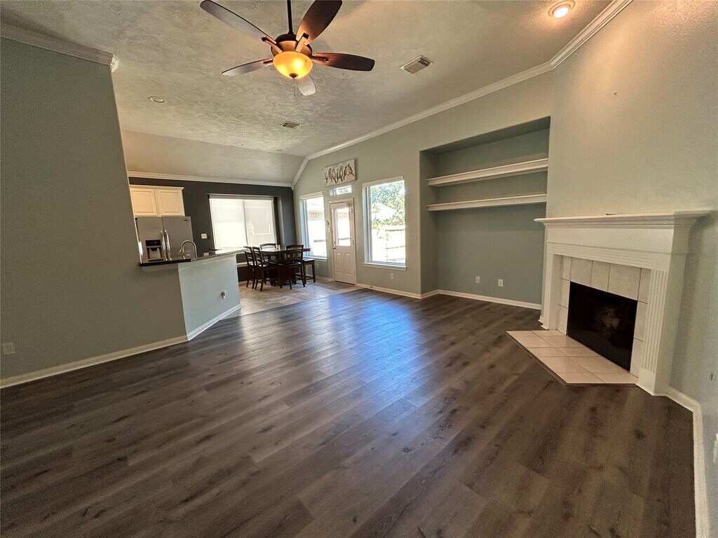 Super cute,bright and cheerfully updated,brick one story nestled on a cozy cul-de-sac in the highly desired community of Kings River. Newer roof,hvacs and low-e windows allow for lower utility bills. Other updates include new oven and microwave,updated counters,faucets,lighting,flooring,gutters. Extra features to enjoy are remote control blinds,gas log fireplace,crown molding,jacuzzi tub,his-n-her closets,higher ceilings,ceiling fans,built-in shelves,private office/room off the primary bedroom,flower beds,raised garden,and backyard shed. Tons of natural light,extended patio,with a convenient location that's 1 block to pool,3 blocks to park and lake,and greenbelt access from the street. Truly a peaceful and pretty place to live. Plus Never flooded,Kingwood Schools! Call Sandy for a private showing today! Owner/agent. MLS# 25219361