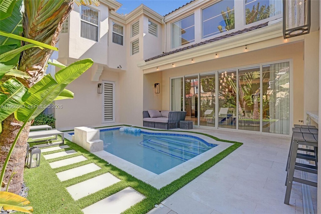 Experience elevated living in the heart of Aventura. Located within a gated community, this fully furnished **corner single family residence** offers 3 bedrooms plus a dedicated office with Murphy bed and private gym area, all completely remodeled with the finest custom finishes and exquisite Italian furnishings throughout. Enjoy dramatic 22-foot ceilings that fill the living spaces with natural light, complemented by sleek glass railings that enhance the home’s open architectural design. Expansive sliding patio doors seamlessly connect the indoors and outdoors, creating effortless indoor-outdoor living and entertaining. The home features marble floors on the first level and Spanish porcelain upstairs. The gourmet kitchen is appointed with Taj Mahal quartzite countertops, a built-in Miele coffee system, and Miele wine cooler. Custom doors, architectural wall panels, designer wallpaper, Toto wall-mounted toilets, custom closets, electric blinds, and LED ceiling lighting elevate the modern aesthetic. Upstairs, the office/loft includes an Italian Murphy bed, lounge area, and dual workstations—ideal for remote work while easily converting into a guest space. The outdoor oasis features a resort-style pool with cascading water feature, lush landscaping, and a custom BBQ area with seating and built-in beer tap. Offered fully furnished for the most discerning tenant seeking luxury, privacy, and prestige in one of Aventura’s most desirable locations. MLS # A11966590
